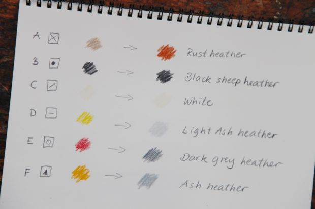 Självklart kan du välja vilka färger du vill men när du komponerar ditt ok kan det vara bra att tänka på hur mönstret är konstruerat och hur de olika färgerna är komponerade tillsammans. Jag utgick från det svenska mönstret och tänkte att mina färger skulle motsvaras i intensitet eller ljus/mörkhetsgrad av de i ursprungsmönstret. Den ljusaste färgen i mönstret bytte jag ut mot min vita och den mörkaste mot min mörkaste grå o s v.
