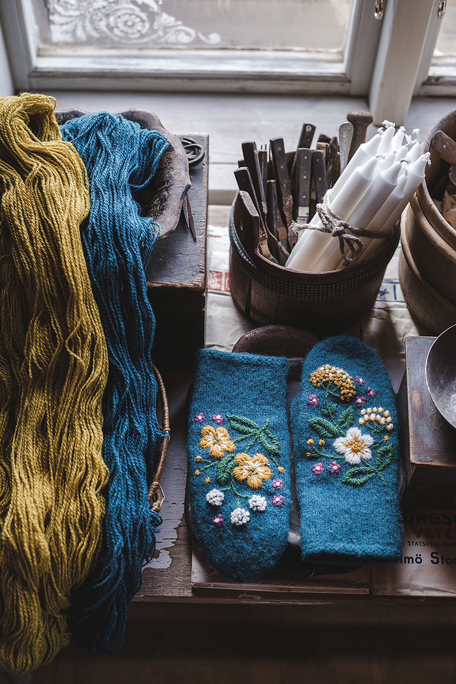 När broderiet är färdigt vänder du vanten med avigsidan ut och drar tillbaka alla lösa garnändar. Fäst dem genom att trä upp dem en i taget på nålen och ”väv” in dem i baksidan av broderiet. Klipp sedan av lösa ändar, ånga eller fukta vanten och dra lite i den för att få den slät och fin. Gör sedan flera par – ju mer du broderar desto skickligare blir du! Kanske får du även idéer till egna mönster att dekorera vantar med?