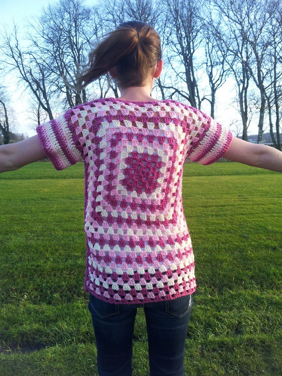 Vi är stolta att presentera en härlig kofta som virkas med en stor mormorsruta över hela ryggen.