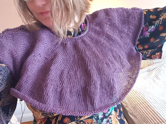 Många oroar sig för storleken och vidden på det färdiga plagget. För att illustrera detta så kan jag visa bilder på hur min tröja såg ut under stickningen, väldigt mycket oversize: