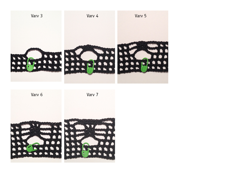 Varv 5: Virka 2 (2) 2 rutor, sedan 4 lm, 1 hst i 1:a hst på föreg varv, 2 hst i nästa och 1 hst i nästa, 4 lm, 1 st i nästa st, 1 (1) 2 rutor. Tumme: 11 (11) 13 lm, hoppa över 2 st, 1 st i nästa st, fortsätt virka rutor varvet runt.