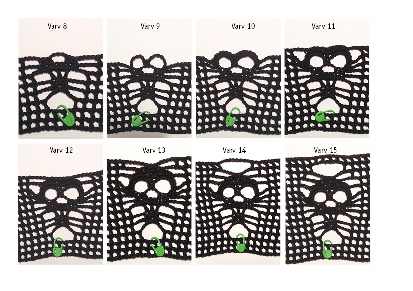 Lägg arbetet med mittmarkören uppåt och varvets början till höger. Sätt en markör i 5:e (5:e) 6:e rutan till vänster om mittmarkören, se bild, (det bör vara minst 4 st från döskallemotivet).