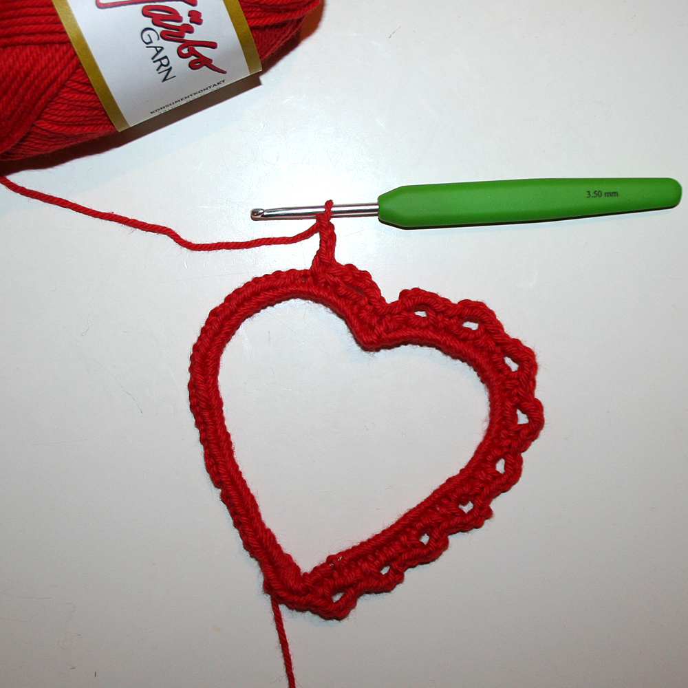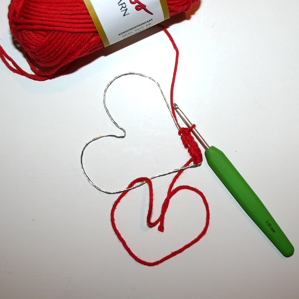 Varv 1: Börja nedtill i hjärtats spets. Virka fasta maskor runt halva stommen. Skjut ihop dem tätt så maskorna döljer stommen. Räkna maskorna. Virka lika många maskor över andra halvan ner tillbaka till spetsen. Virka 3 fm över spetsen. Det ska vara en fm i mitten på spetsen.