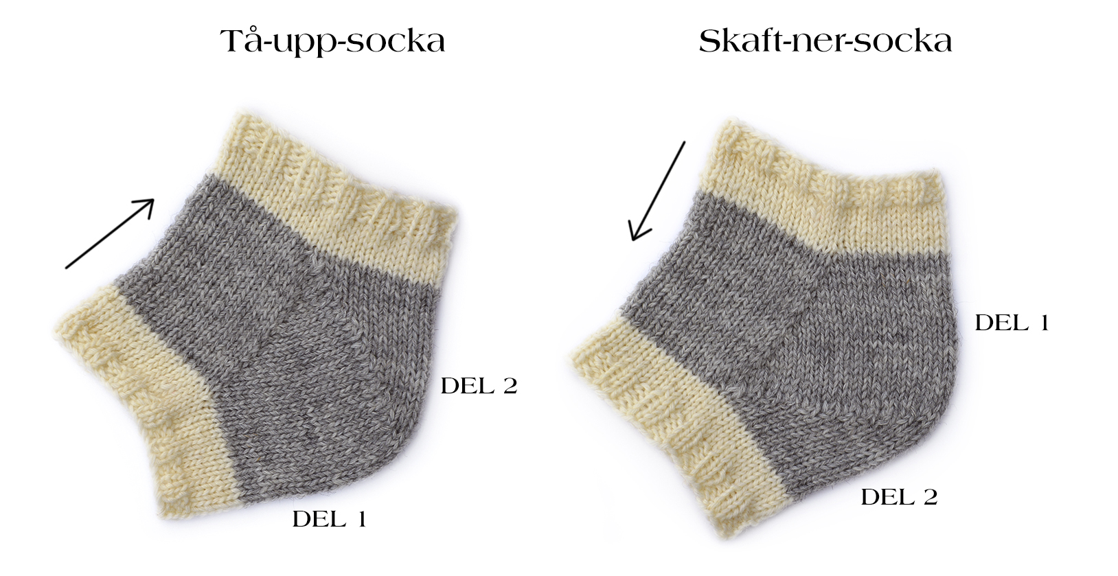 Fleegle heel fungerar på både tå-upp-socka och skaft-ner-socka. Eftersom den passar foten även ”uppochned”, så stickar du den enligt samma beskrivning både uppifrån och nedifrån. Kilpartiet (del 1) som stickas över hela varv gör att sockan blir lätt bakåtlutad och får en fin form.
