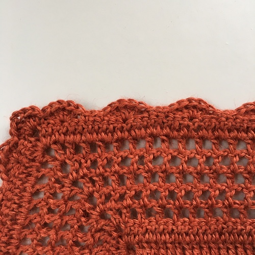 3 st i neste 5-lmb, 3 lm, ho 1 m, 1 st i neste 1-lmb, 3 lm, ho 1 m, 3 st i neste 5-lmb, 2 st sm i de siste 2 m.