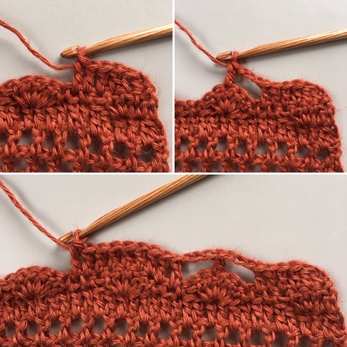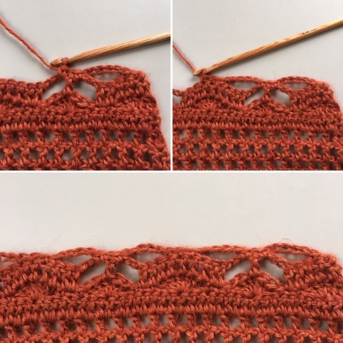 1 st i neste m, *3 st i neste 5-lmb, 3 lm, ho 1 m, 1 st i neste 1-lmb, 3 lm, ho 1 m, 3 st i neste 5-lmb,