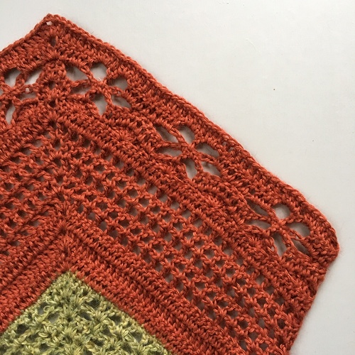 2 lm, 2 st sm i de første 2 m, 3 st i neste m, *ho 2 m, 1 fm i neste m, 1 lm, ho 1 m, 1 fm i neste m, ho 2 m, 5 st i neste m*, gjenta *-* 4 ggr til. Ho 2 m, 1 fm i neste m, (2 st, 2 lm, 2 st) i m-lmb, 1 fm i neste m, *ho 2 m, 5 st i neste m, ho 2 m, 1 fm i neste m, 1 lm, ho 1 m, 1 fm i neste m* gjenta *-* 4 ggr til. Ho 2 m, 3 st i neste m, 2 st sm i de siste 2 m.