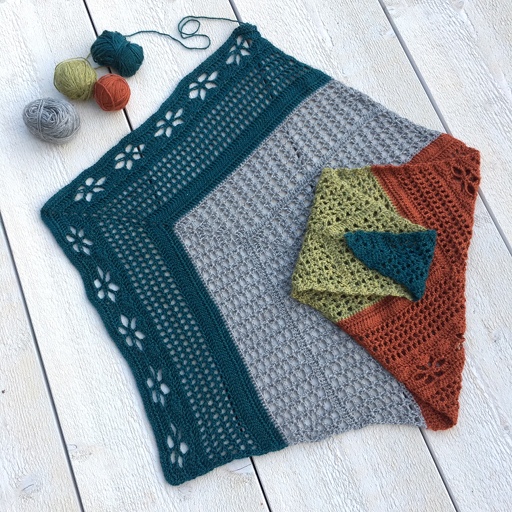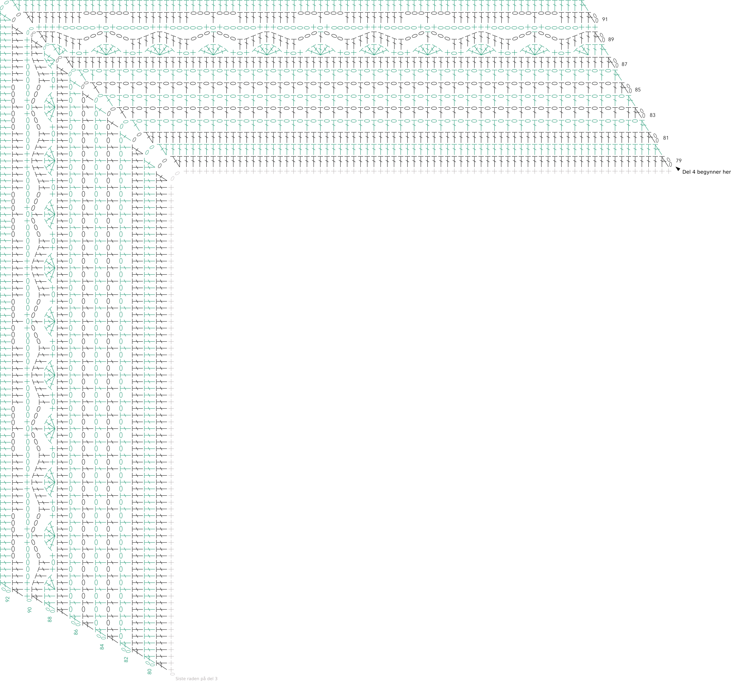 1 st i neste m, *1 st i hver av de neste 3 m, 3 st i neste 5-lmb, 3 lm, ho 1 m, 1 st i neste 1-lmb, 3 lm, ho 1 m, 3 st i neste 5-lmb*, gjenta *-* 4 ggr til. 1 st i neste m, 2 st sm i de siste 2 m.