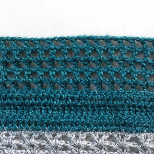 1 lm, 1 st i neste m, *1 lm, ho 1 m, 1 st i neste m*, gjenta *-* til det er 2 m igjen på raden, 2 st sm i de siste 2 m.