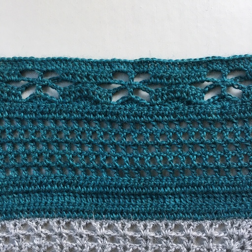 1 st i hver av de neste 5 m, 3 lm, ho 3 m, 1 st i neste m, *3 lm, ho 3 m, 1 st i hver av de neste 9 m, 3 lm, ho 3 m, 1 st i neste m*, gjenta *-* 3 ggr til. 3 lm, ho 3 m, 1 st i hver av de neste 5 m, 2 st sm i de siste 2 m.