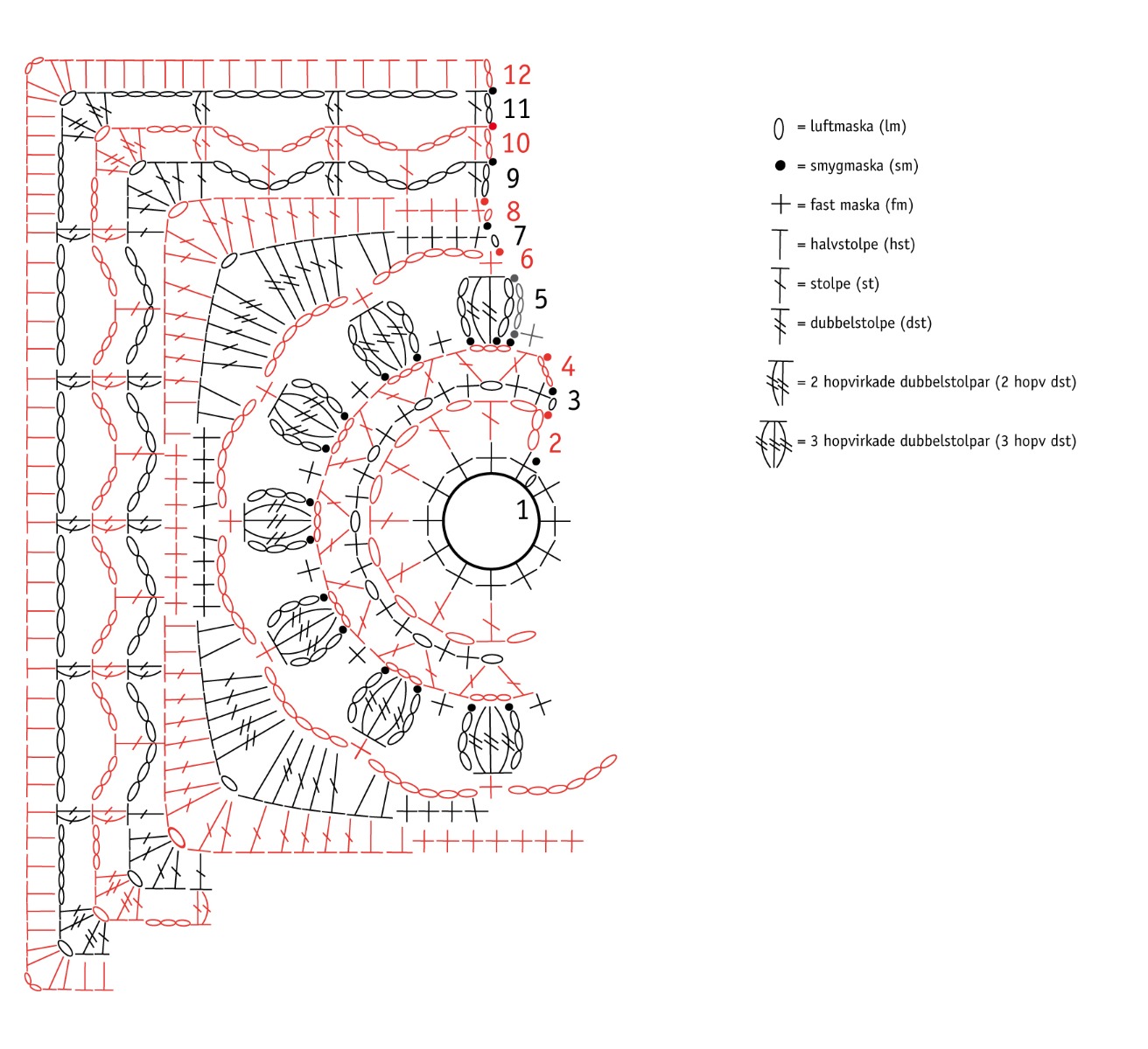 Varv 5: 1 sm i 1:a och 2:a lm i lmb, [3 lm, 2 hopv dst, 3 lm, 1 sm] om samma lmb, 1 fm mellan lmb, * [1 sm, 3 lm, 3 hopv dst, 3 lm, 1 sm] om nästa lmb, 1 fm om m mellan lmb*, upprepa *-* ytterligare 10 ggr, sluta med 1 sm om den första lmb, 3 lm, 1 sm i 3:e lm i v början.