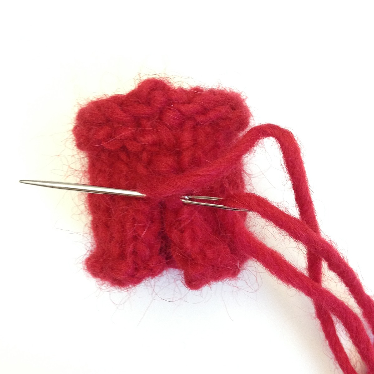 Ta av garnet ganska långt och fäst starttråden. Använd den långa tråden att sy ihop ringen med.
