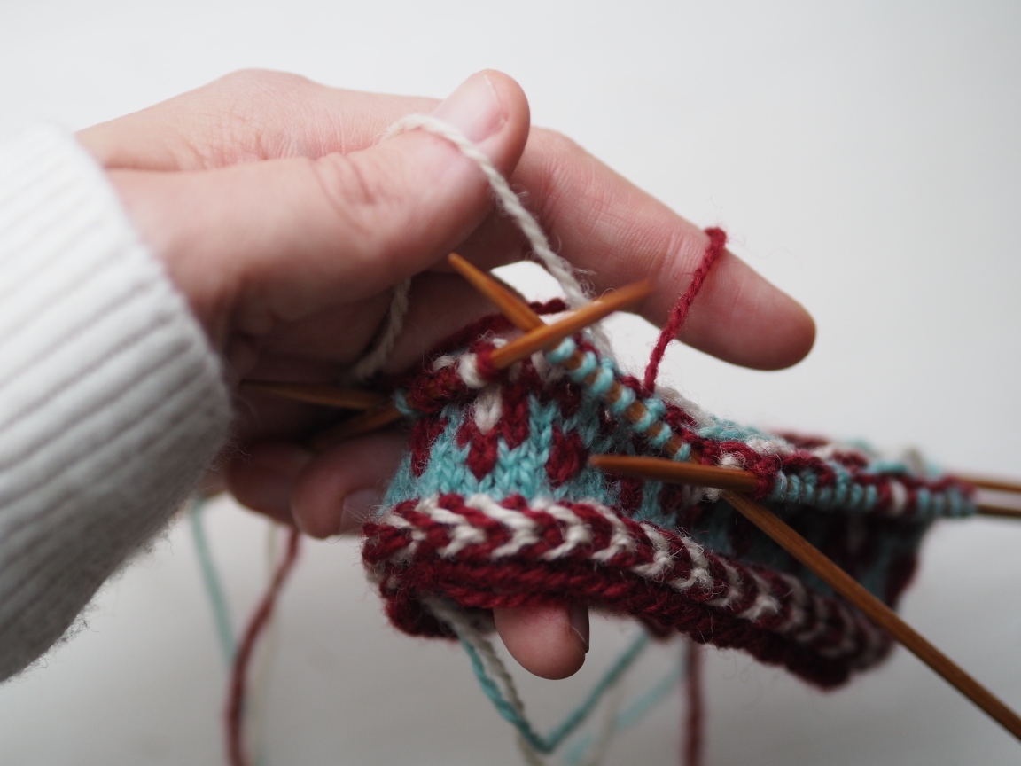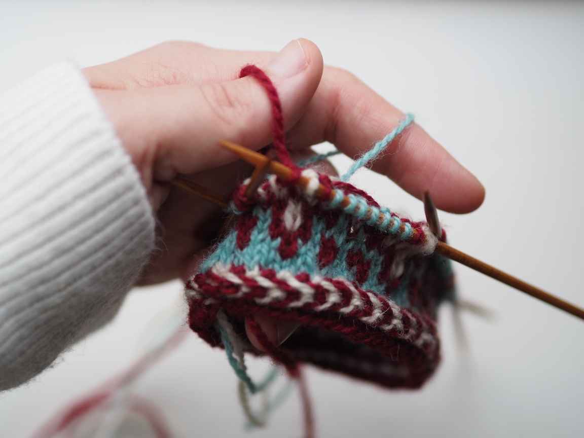 Nyt varren kirjoneuleosuus on valmis – jatkamme joustinneuleisella resorilla, jotta lapasista tulee erityisen hyvin istuvat!