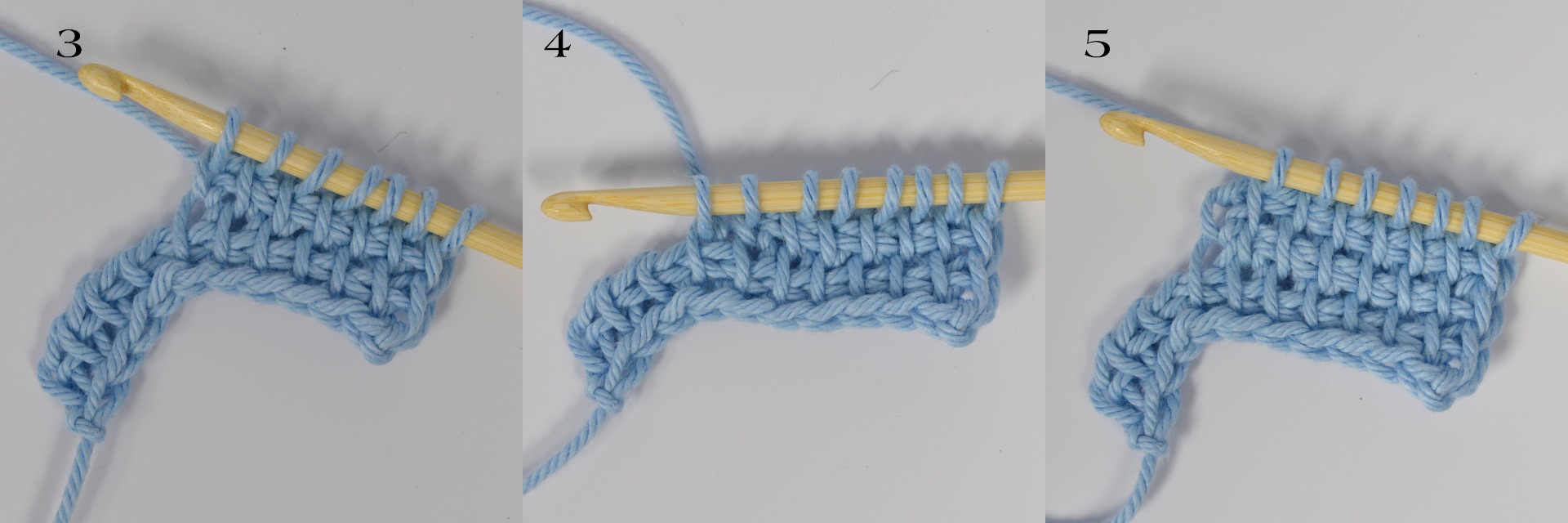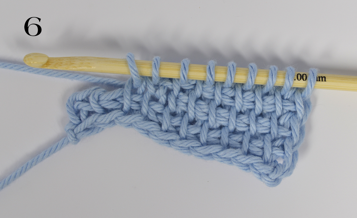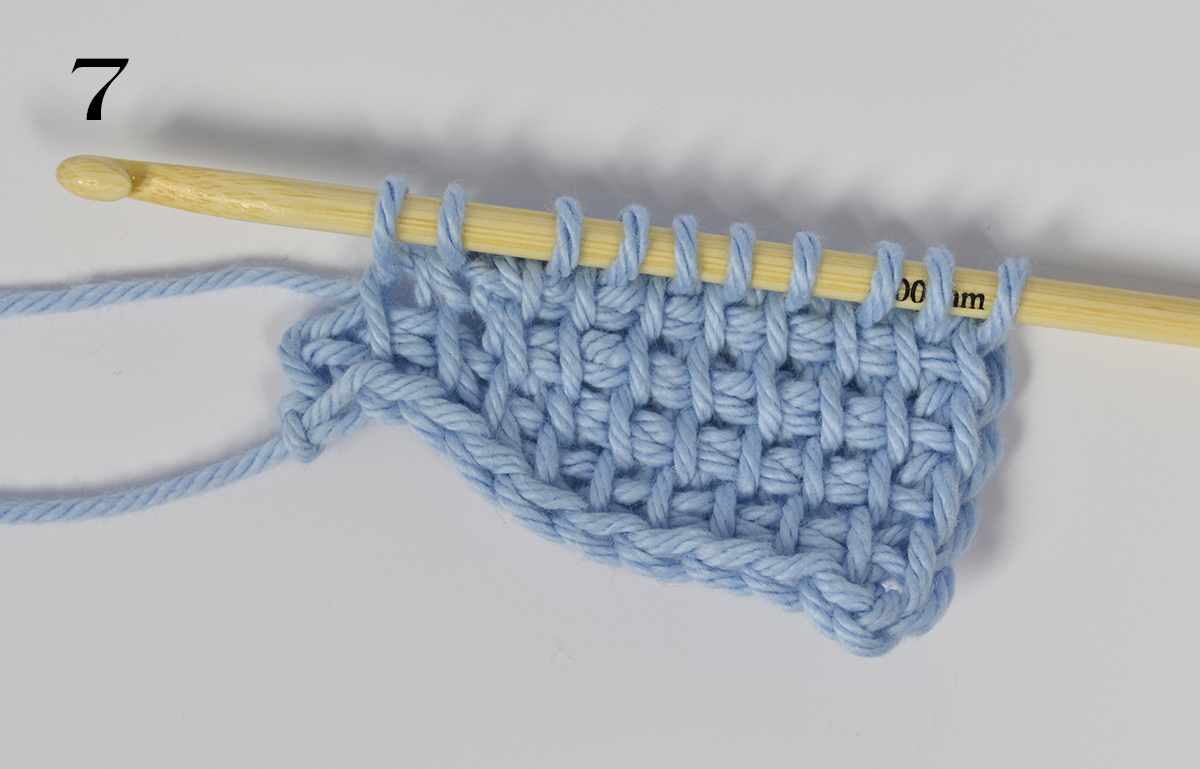 3. Framåtgående: Hämta upp garn ur samma 6 m (på sista m görs nedtaget som på en kantm).