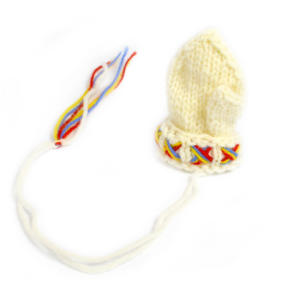 Gör en liten tofs av gult, blått och rött garn, som du fäster på en vit tråd i önskad längd. Sy fast den i vantens nederkant.