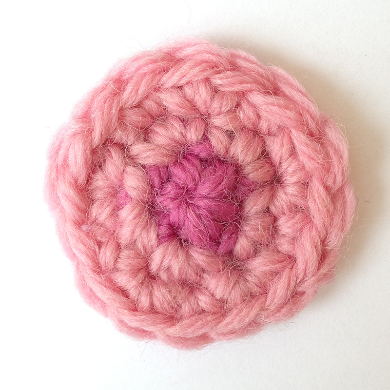 Varv 2: Anslut ljusrosa garn och virka 2 fm i varje fm = 10 fm.