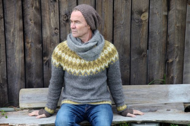 För några år sedan stickade jag en Riddari till min man Dennis och det är fortfarande hans älsklingströja. Jag får ofta många frågor om färgerna på garnet och tyvärr måste jag meddela att den senapsgula färgen inte längre går att få tag på. Men den goda nyheten är att det finns så många andra fantastiska färger och färgkombinationer att välja på. Dennis började själv sticka för ett drygt år sedan och han har nu stickat en Riddari som jag tycker har så varma färger.
