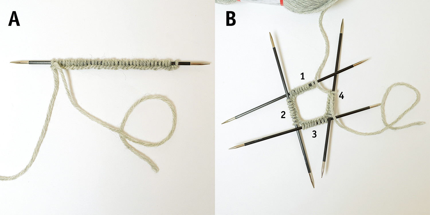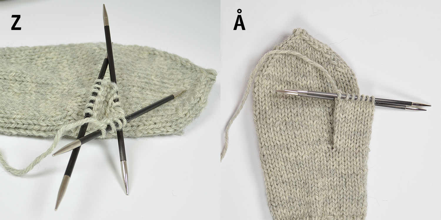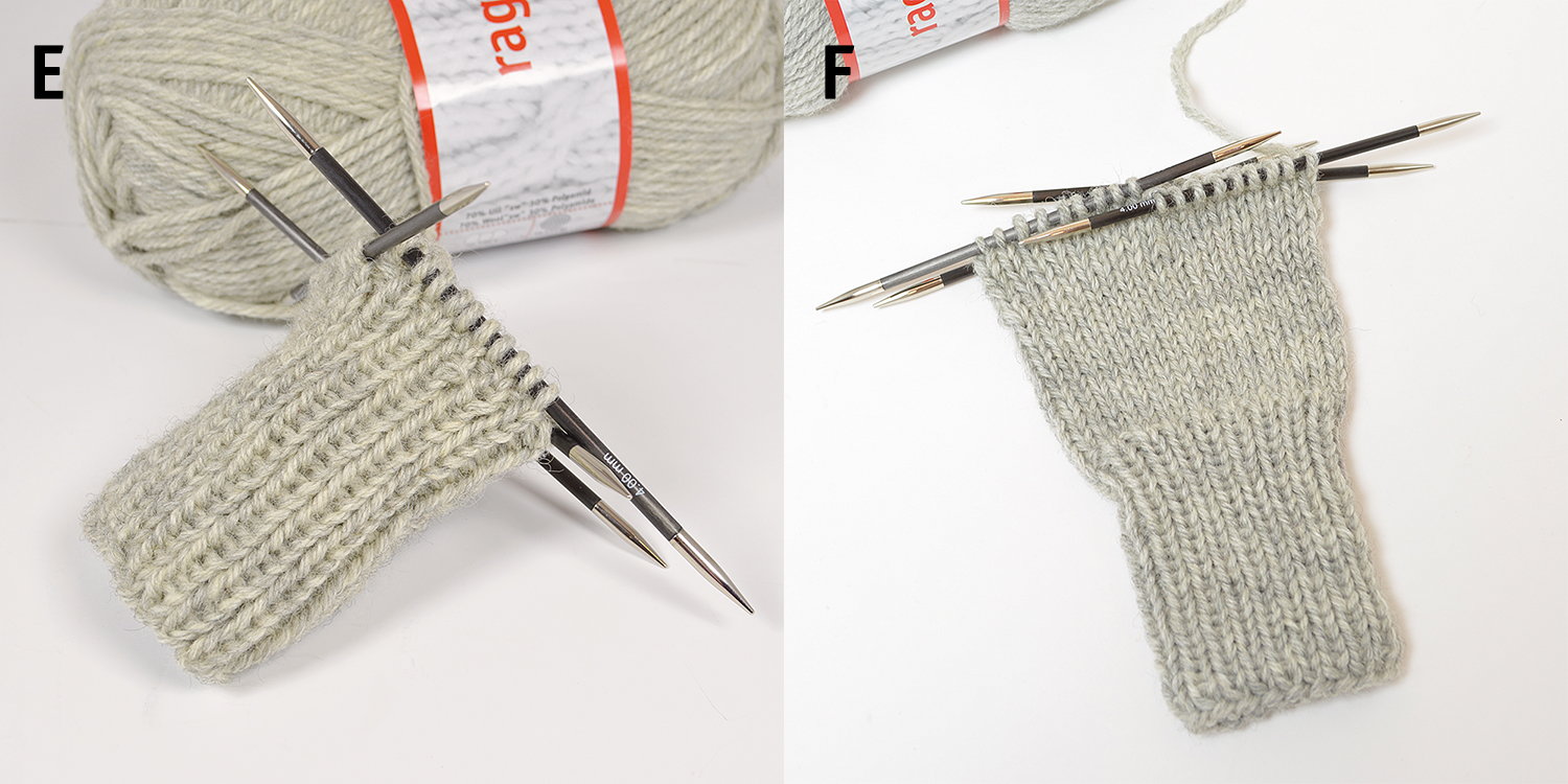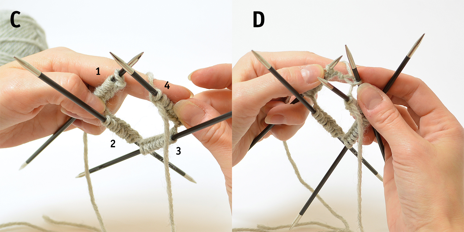 C-D. Ta tag i stickorna enligt bild. OBS! Se till så att maskorna och stickorna inte har vridit sig!Börja sticka över sticka 1 och fortsätt med 2, 3 och 4, runt, runt. Sticka resår (1 rm, 1 am).