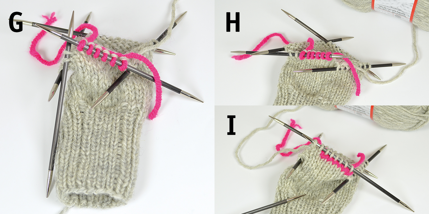 G. Sticka rm över sticka 1 och 2. På 3:e stickan markeras för tummens placering genom att sticka med en bit garn i en avvikande färg: Sticka rm över de första [6] m.