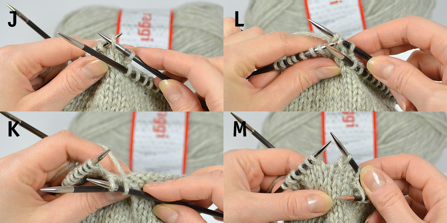 J. På sticka 1: Nu ska vi göra en minskning som lutar åt vänster, alltså inåt på handen: Stick ner höger sticka ovanifrån i nästa m (som om du skulle sticka den avig, men garnet bakom arbetet)…