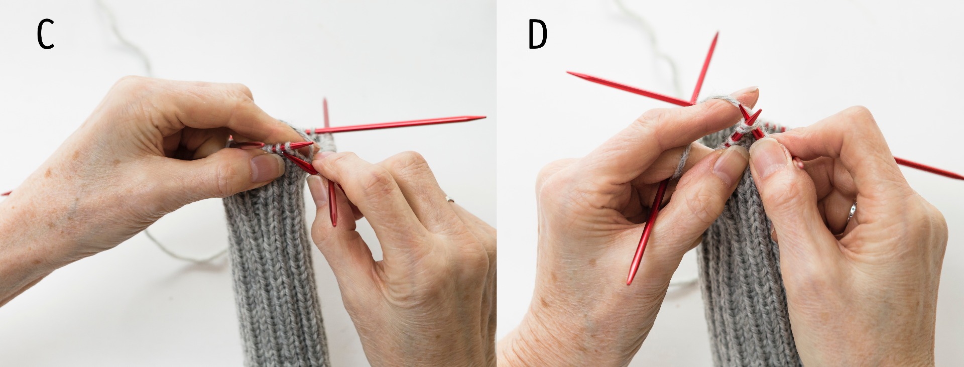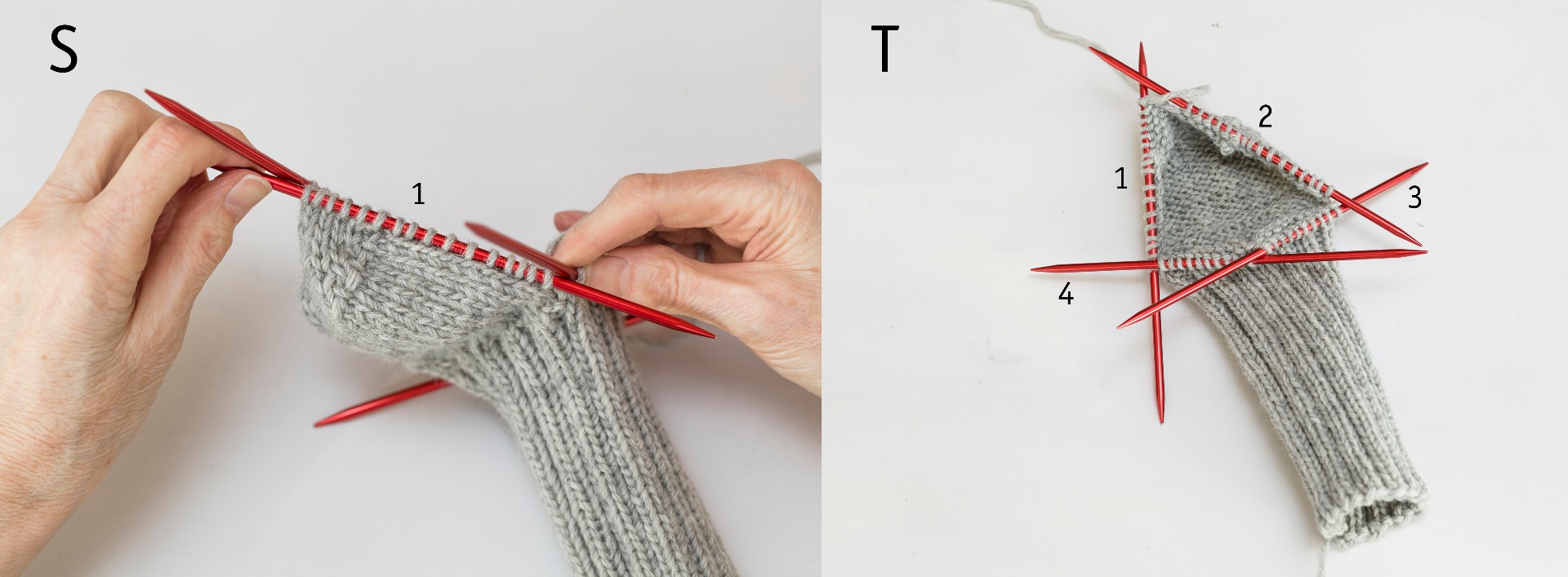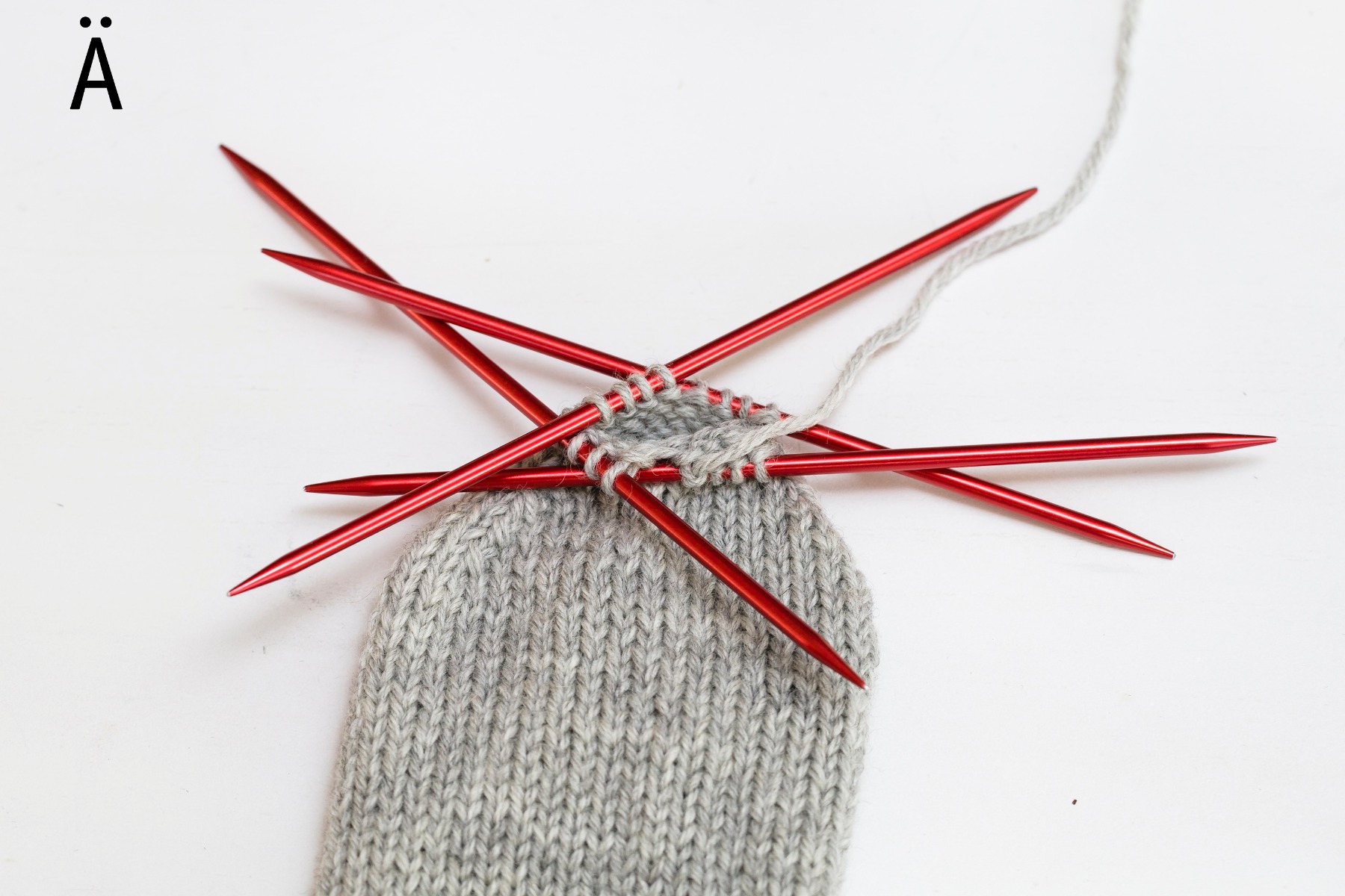 Fördela maskorna över 4 strumpstickor så det finns [12] m på varje sticka. Börja sticka med den femte strumpstickan som på bilden, så du sluter till en ring och stickar runt. Se till att maskorna inte vrider sig när du börjar.