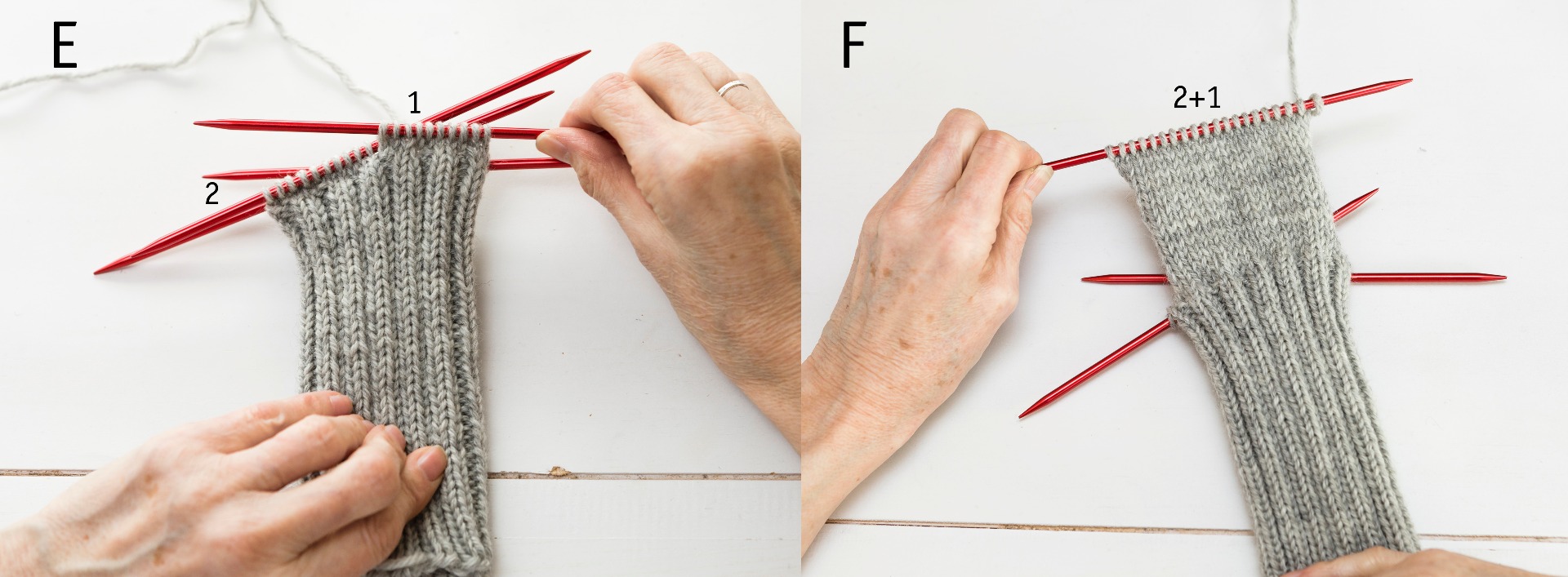 E. Nu stickas enbart över sticka 1 och 2. Maskorna kan med fördel flyttas över på en sticka.