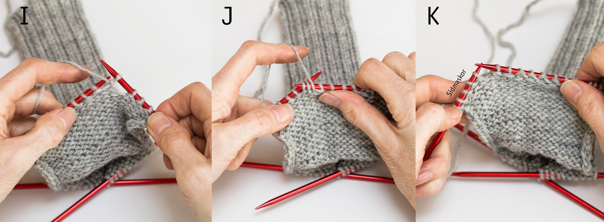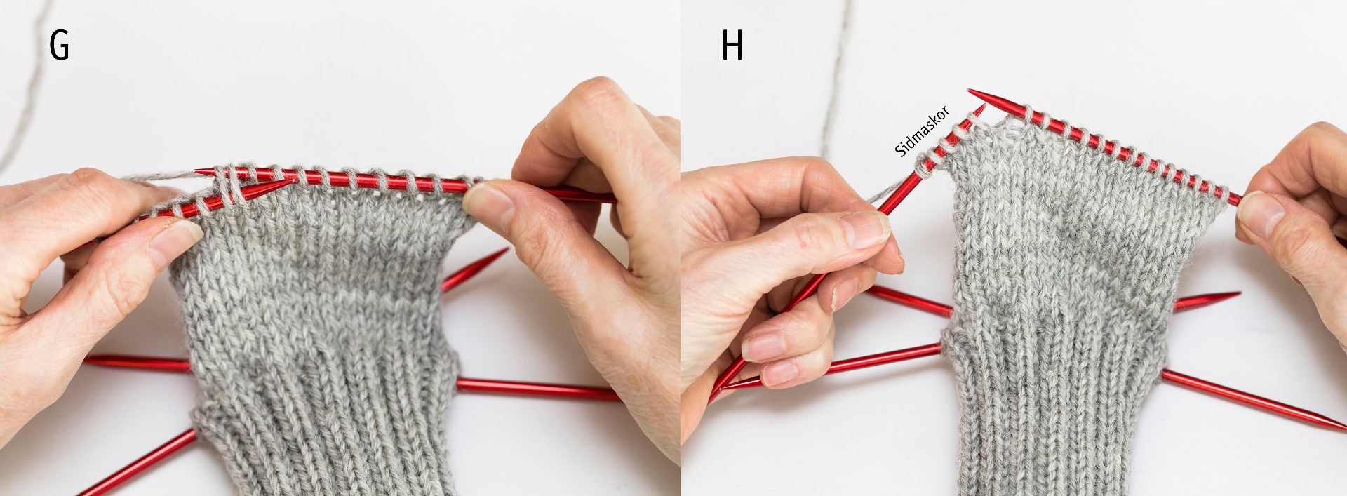 Slätstickning: Det som kan vara bra att känna till är att när man stickar runt på fyra stickor (eller rundsticka) så gör man slätstickning med enbart räta maskor (rm), eftersom man bara stickar från rätsidan, runt runt. MEN när man stickar hälkappan på sockan stickar man fram och tillbaka över två stickor och då blir slätstickningen rm från rätsidan och am från avigsidan.