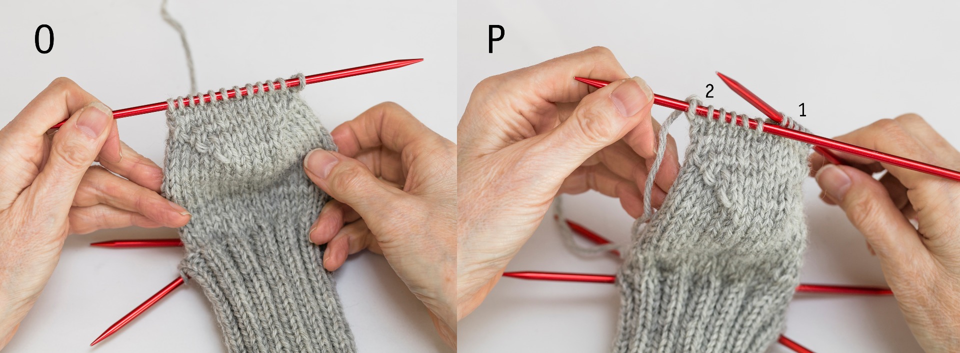 P. Fördela maskorna åter på två stickor, sticka 1 och 2.