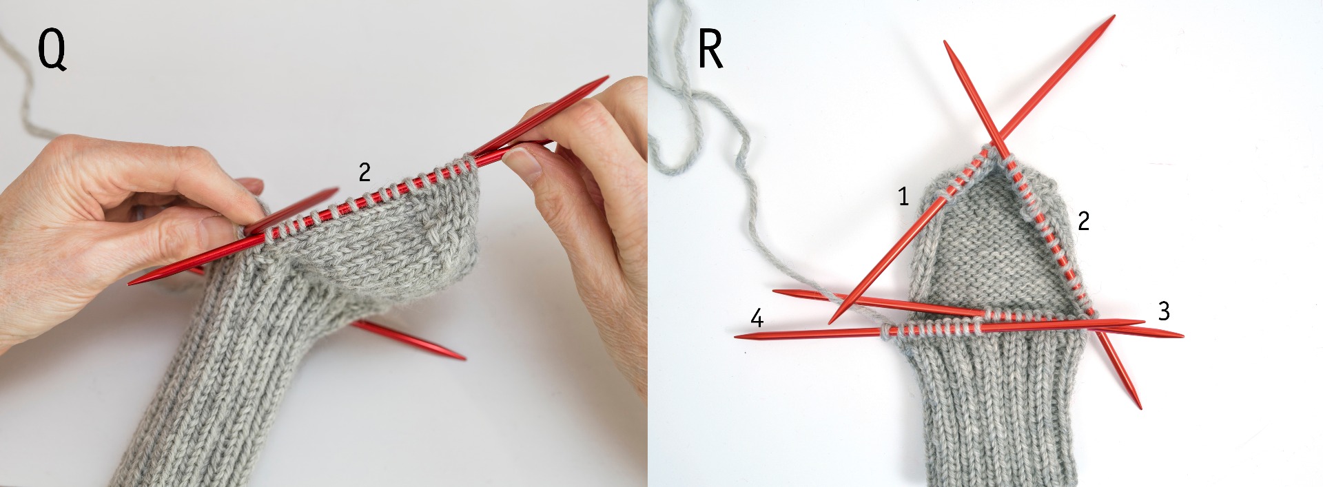 Q. Fortsätt med sticka 2 och plocka upp [11] nya maskor på sockans högra sida. Plocka upp maskor genom att hämta upp garn genom den yttersta maskan av hälkappan. Fördela antalet nya maskor jämnt över hälkappans varv.