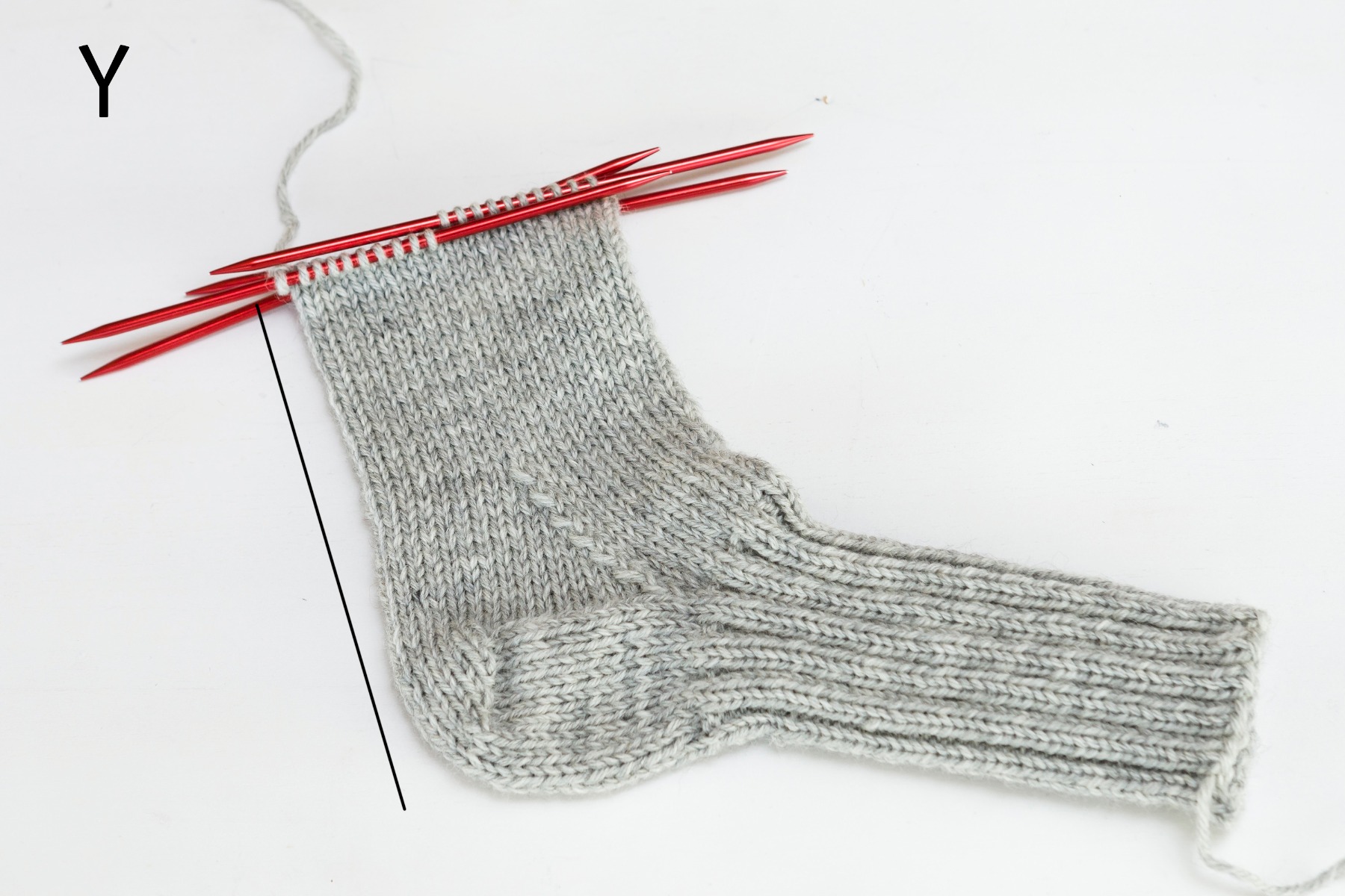 Y. Fortsätt sticka slätstickning runt (rm) till foten mäter [19] cm. Måttet tas från hälkappan och framåt.