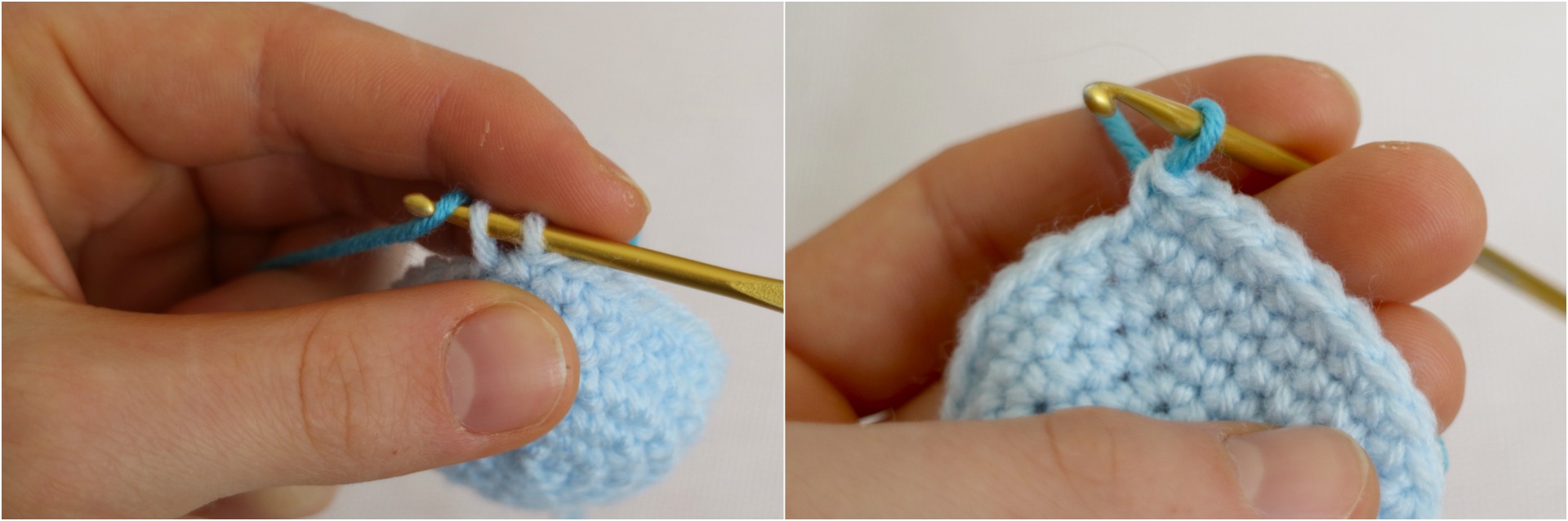 Varv 3: Vänd inte när du virkat klart varv 2, utan virka 2 fm i nästa fm i samma riktning istället. Virka sedan 1 fm i var och en av följande maskorna, förutom i de två sista. I den näst sista gör du 1 st, och i den näst sista gör du 2 st.