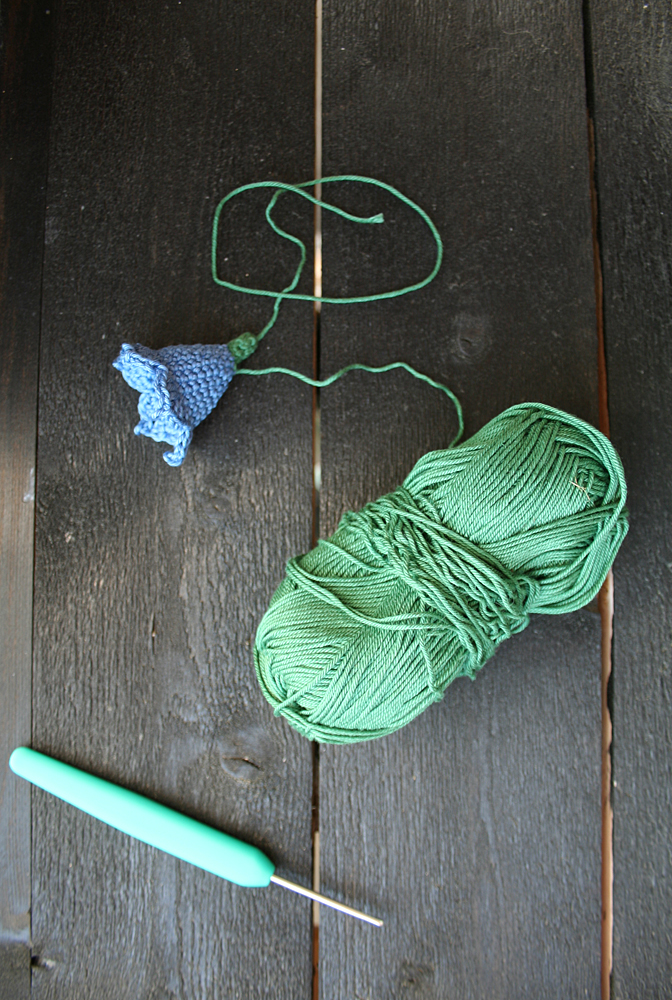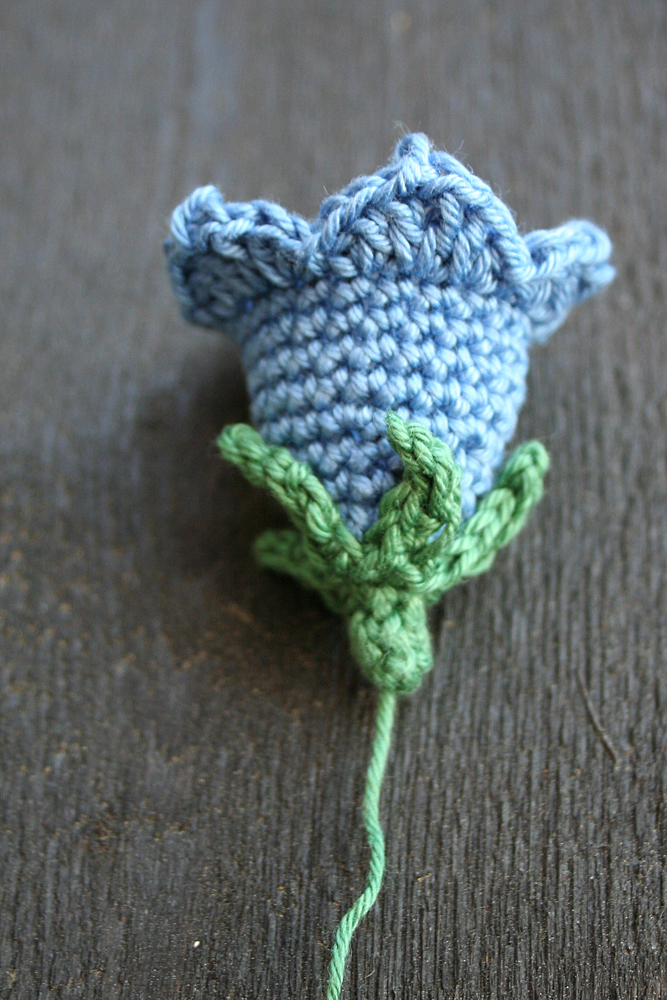 Varv 2-3: Virka fm i fm. Byt till blått garn i sista genomdraget på sista fm. OBS! Ta inte av den gröna tråden, låt den hänga på utsidan av blomman till senare.