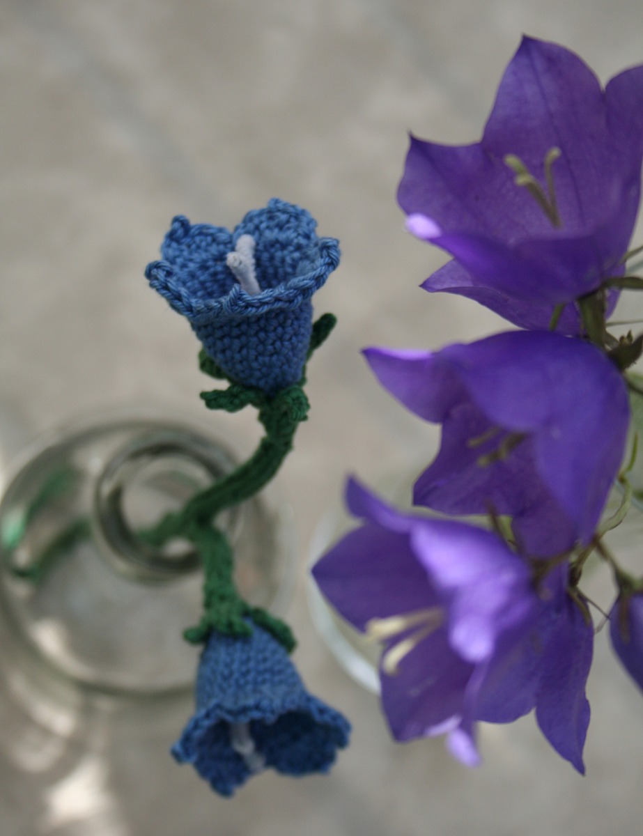 Trä in en ståltråd i stjälkarna. Se till att den även går in i blåklockan, böj till den där inne så den stannar kvar. Ståltråden i de kortare stjälkarna sticker du in i den längsta i-corden. Sy fast i-corden i den långa i-corden.