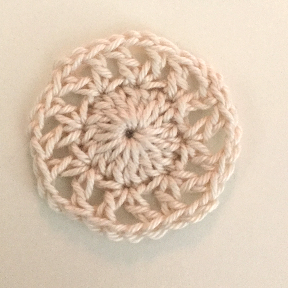 Varv 2: 5 lm, 1 st i samma lm som sm, (hoppa över 1 st, [1 st, 2 lm, 1 st] i nästa st) 7 ggr, avsluta varvet med 1 sm i 3:e lm.