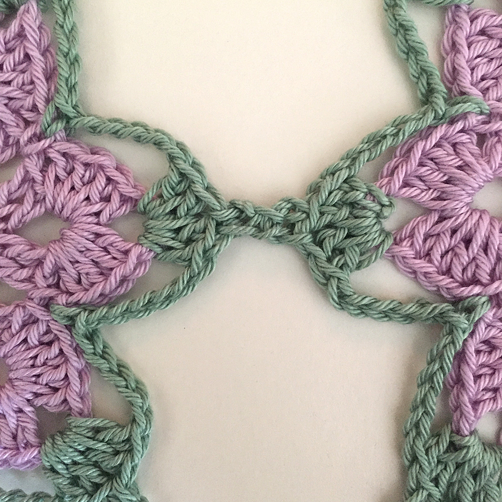 Varv 5: Virka fram till picoten. Virka ihop picoterna så här: 1 lm, 1 fm i picoten på den andra stjärnan, 1 lm, 1 sm i 1:a lm, fortsätt med varv 5 enligt beskrivningen.