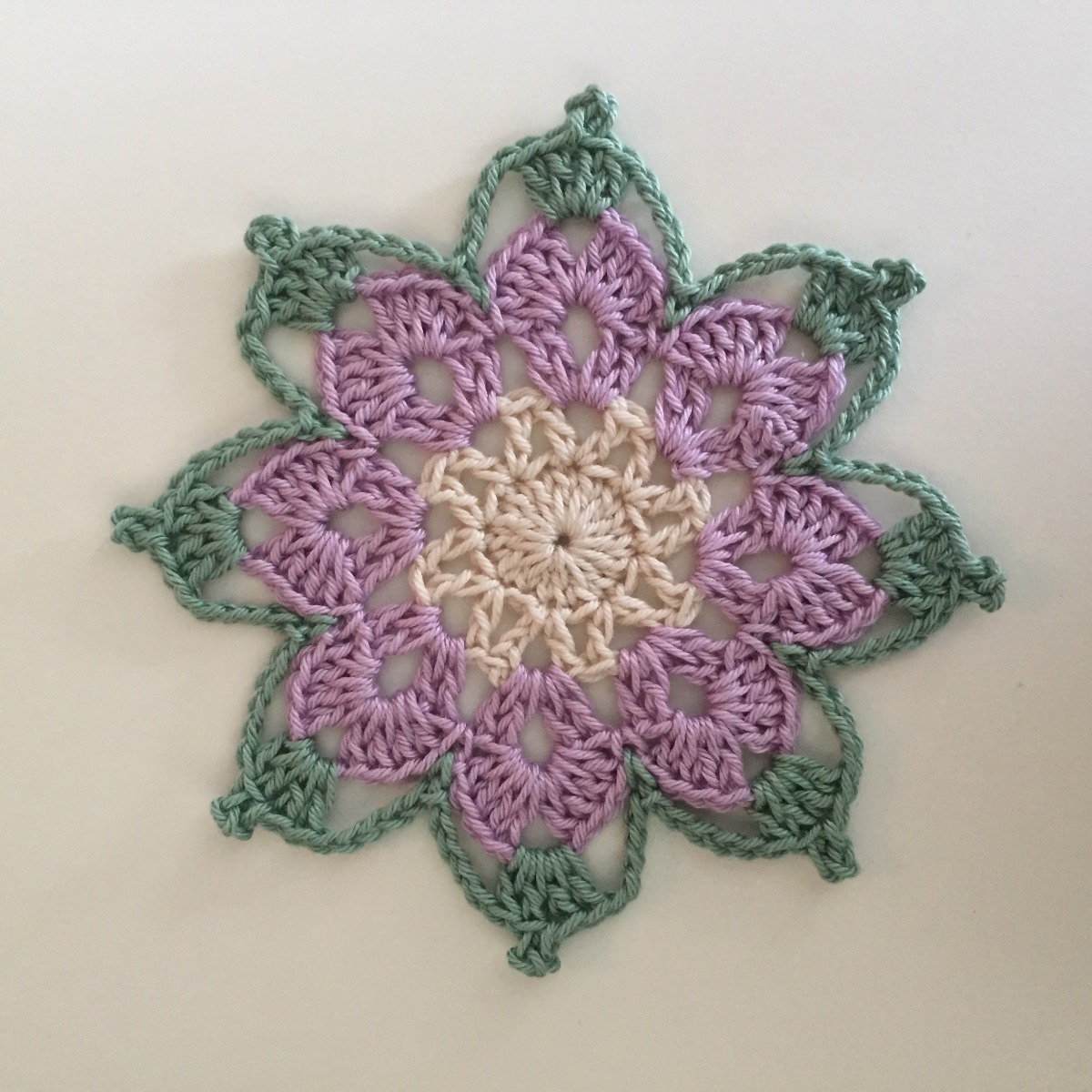 Varv 5: Börja i en 3-lmb. ([2 st, 1 picot, 2 st] i 3-lmb, 5 lm, 1 fm i fm, 5 lm) 8 ggr, avsluta med 1 sm i 3:e lm (alt 1:a st).