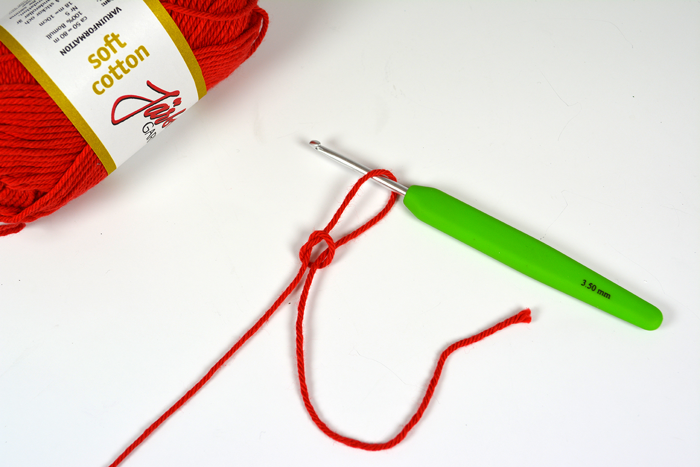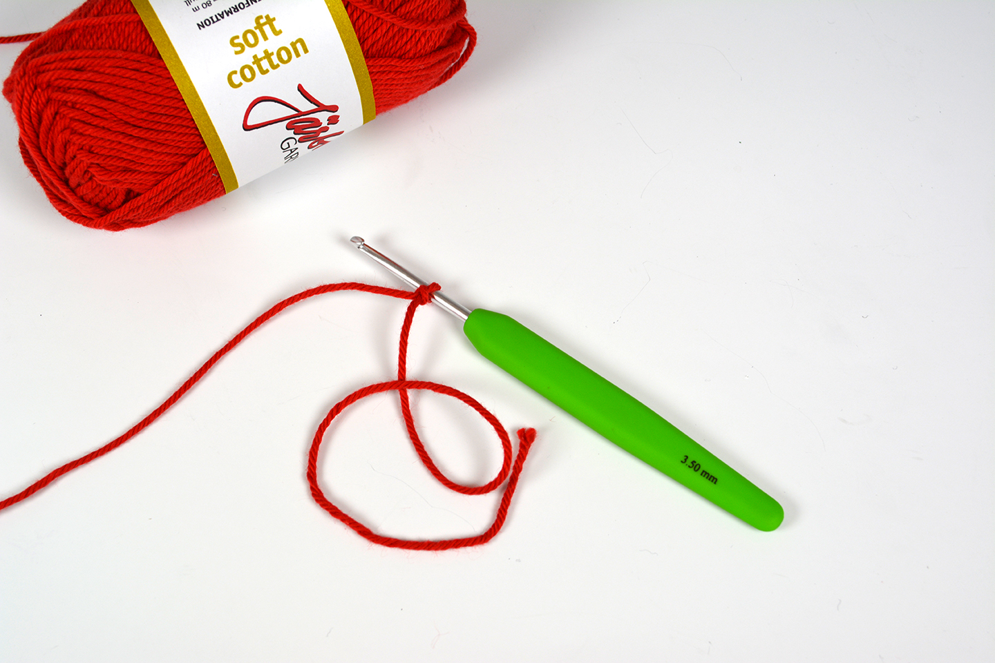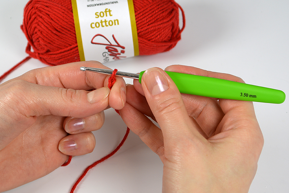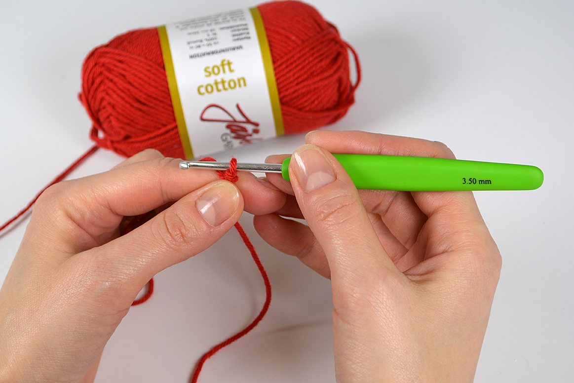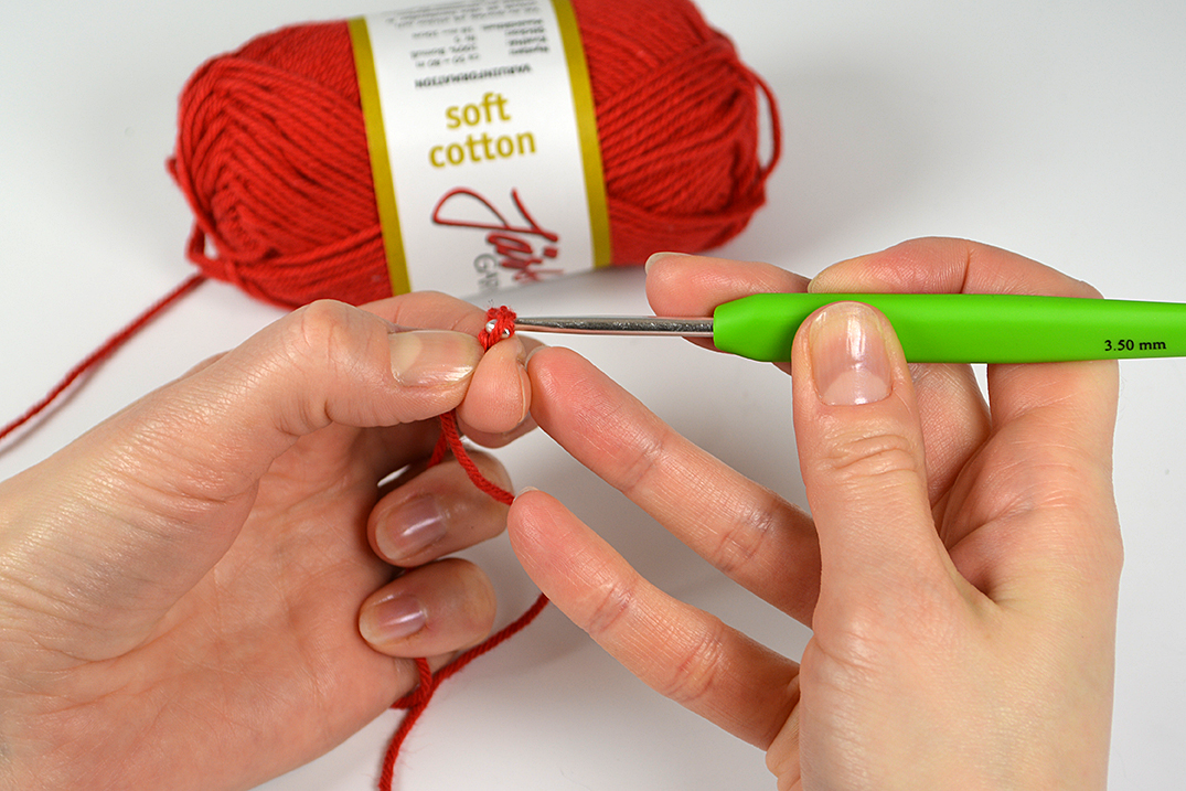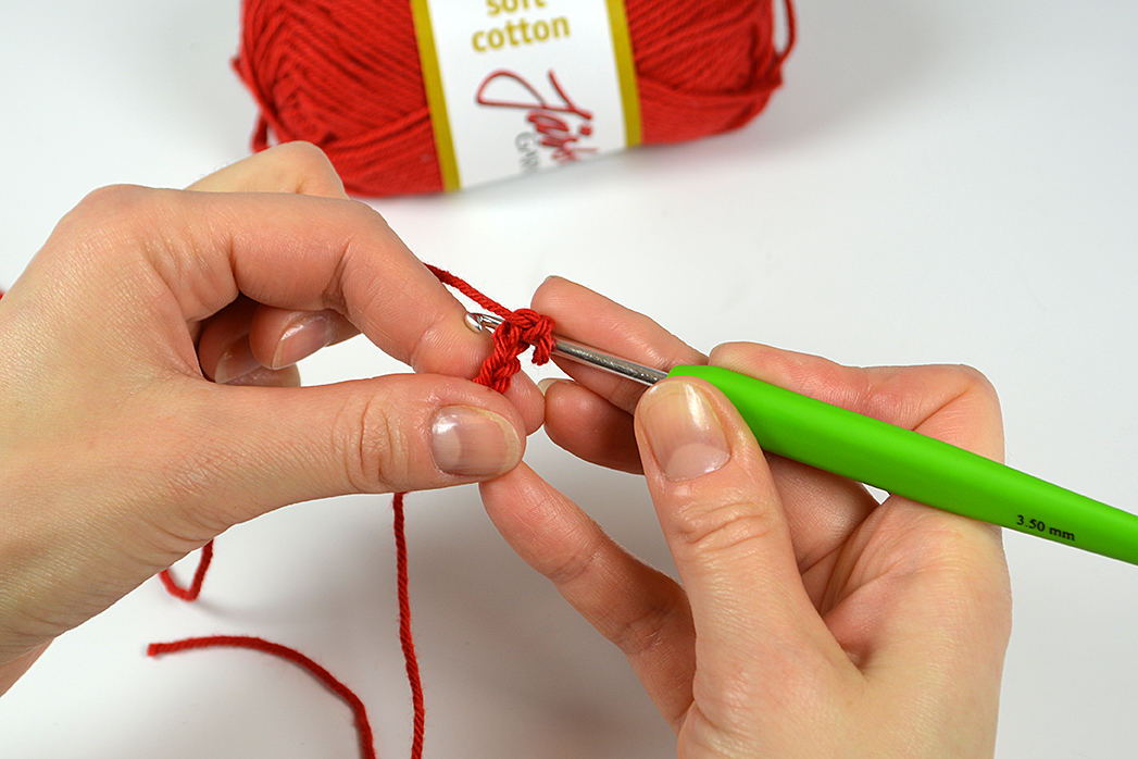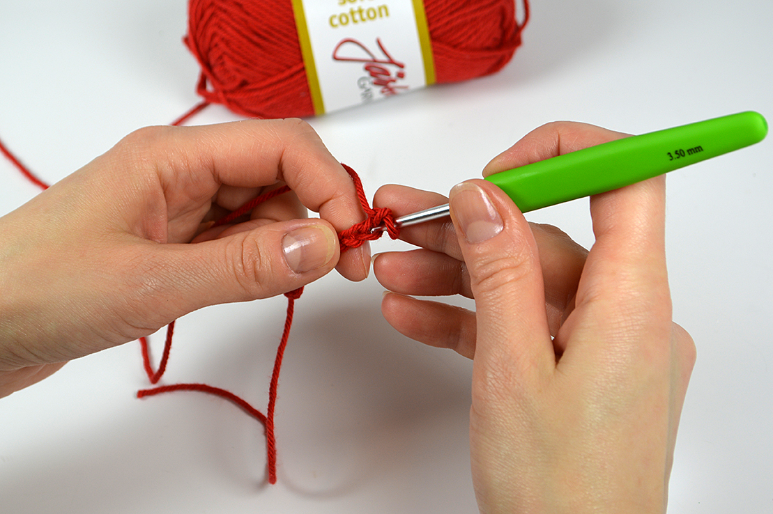 Sätt virknålen i öglan och dra åt lätt, virknålen ska inte sitta fast i öglan utan glida lätt, men utan att öglan är för stor.