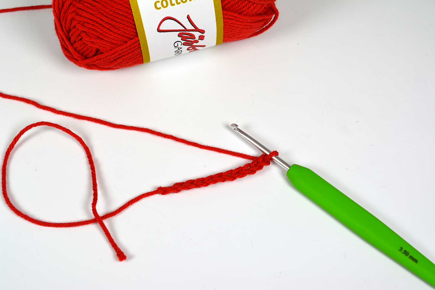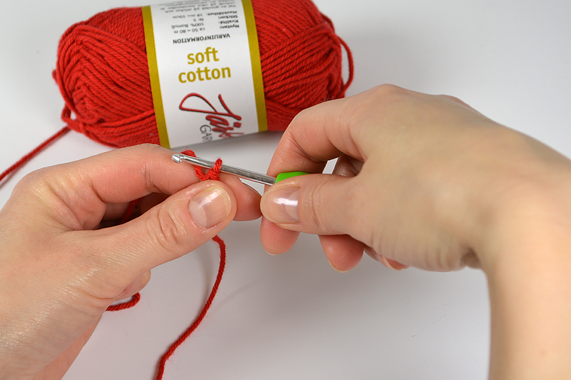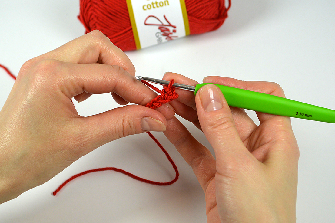 …och dra garnet genom båda öglorna på virknålen. Nu har du gjort din första fasta maska!