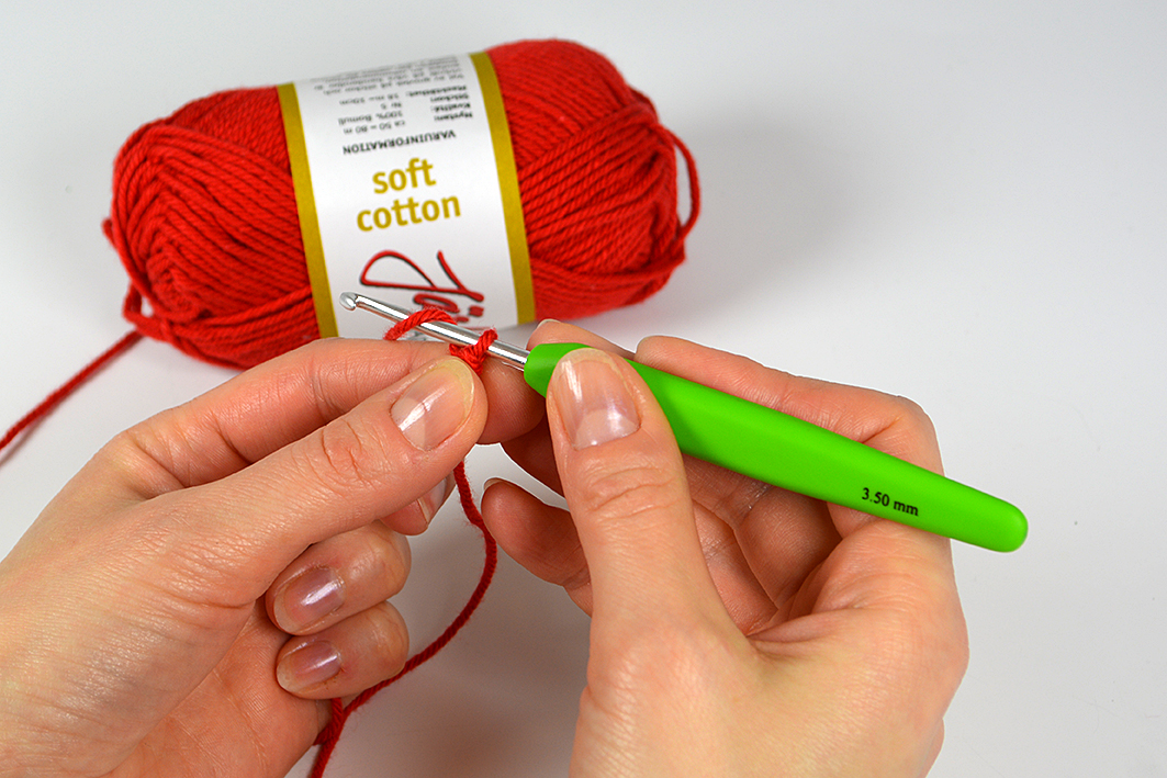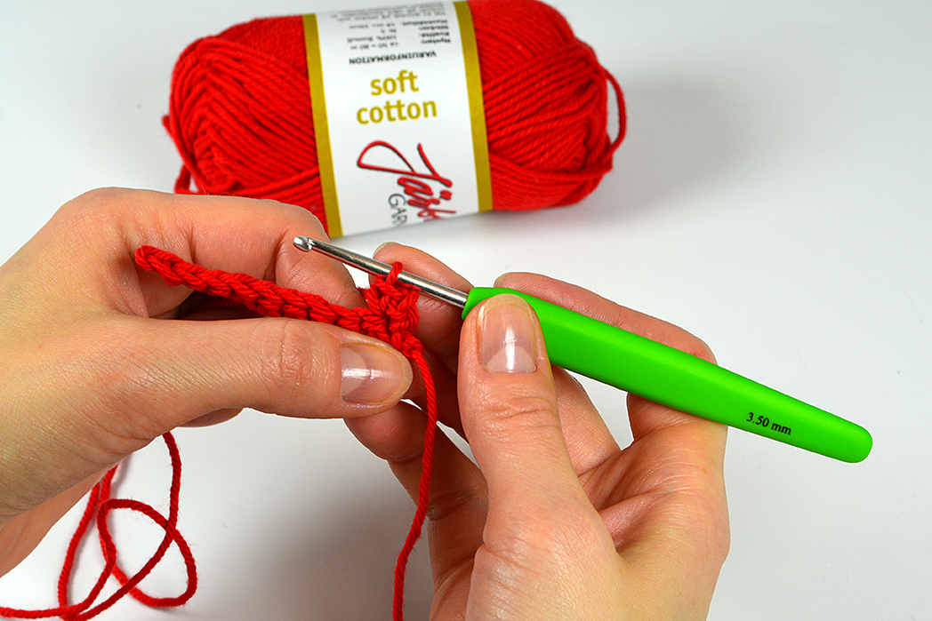 …och dra upp tråden genom luftmaskan. Dra upp tråden lagom mycket, så att du kan hålla virknålen vågrät. Här är det övning som gäller, hur mycket man ska släppa efter på garnet. Det ska inte strama och inte heller bli bubbligt.