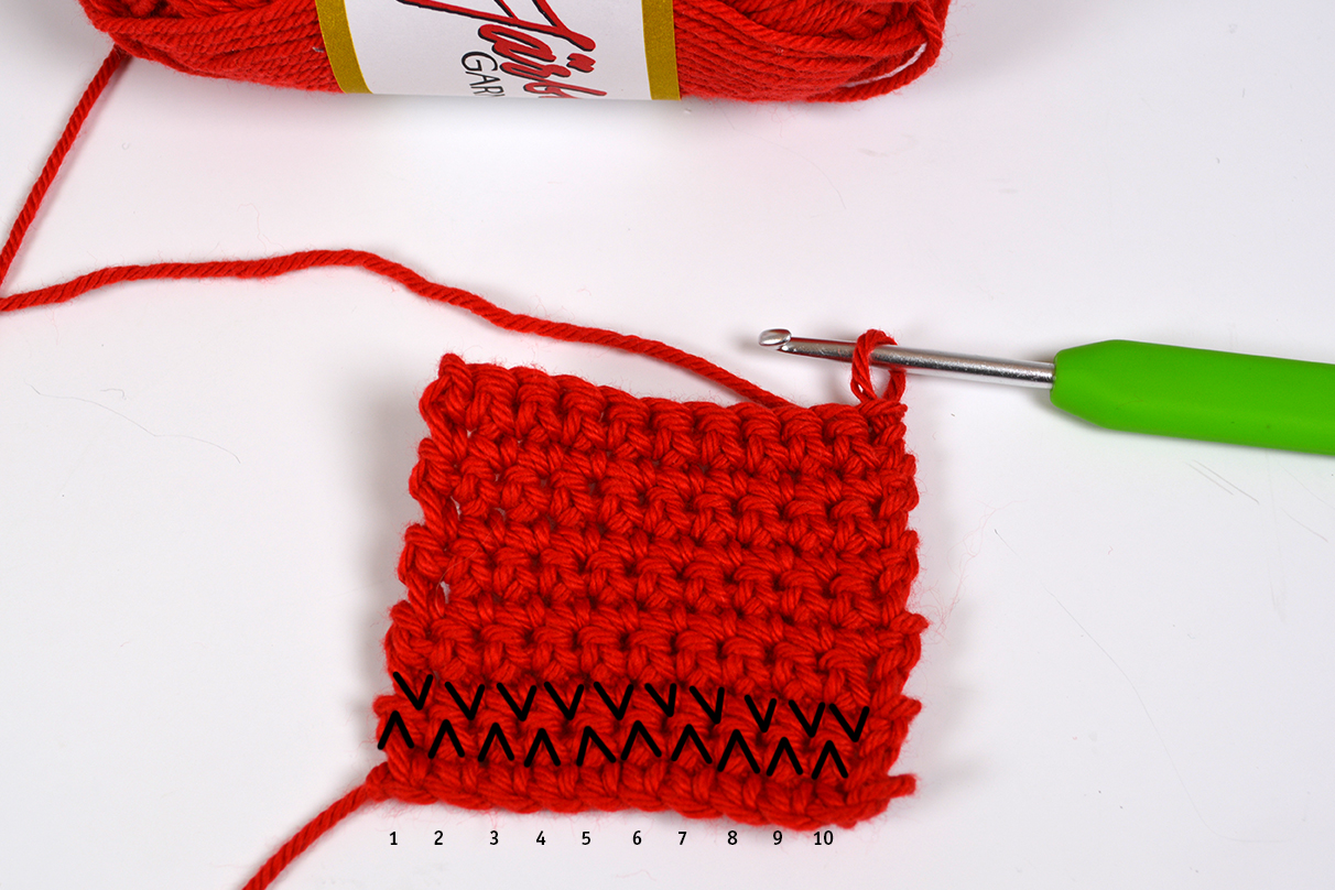 Det enklaste sättet att räkna fasta maskor på är att titta på ovansidan av arbetet, d.v.s. raden med öglor som bildas. Detta funkar bara för det senast virkade varvet.