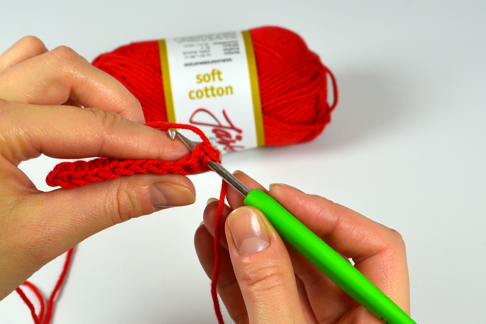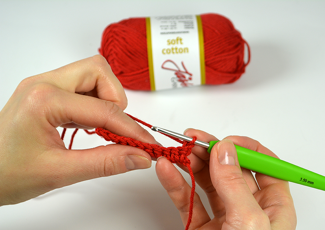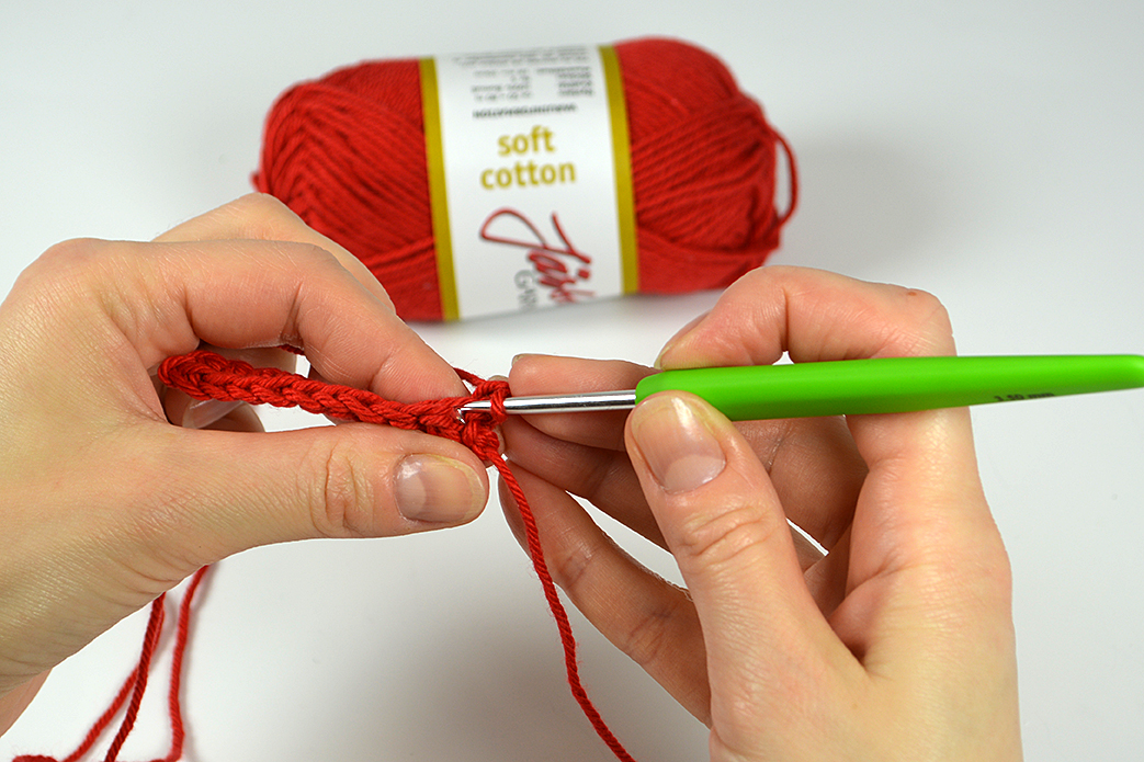Varv 1: Börja i 2:a lm från nålen, virka 1 fm i varje lm = 10 fm. Vänd.