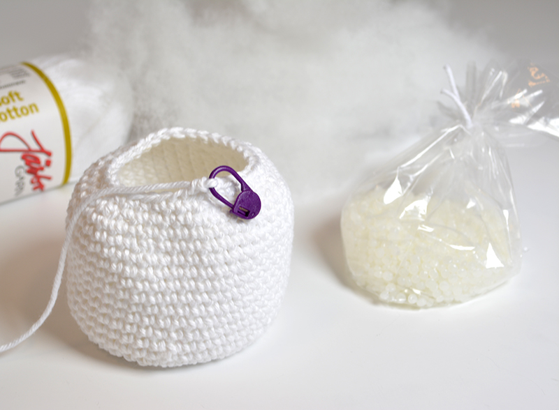 Tips: Vill du ha lite mer tyngd i underkroppen så fyll med lite plastgranulat (finns på t.ex. Panduro). För att plastkulorna inte ska trängas ut genom garnet, så kan du lägga dem i en liten tygbit eller plastpåse och knyta ihop. OBS! Använd inte plastpåse och granulat om ett litet barn ska få snögubben. Kvävningsrisk! Gäller även pärlor. Sy då istället ögon och knappar med svart garn.