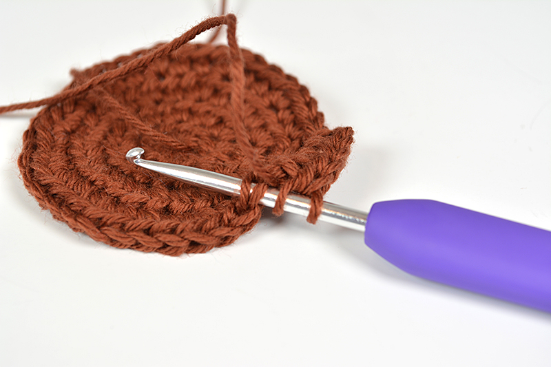 Du kan, om du vill, ta ihop varven med 1 sm och börja nästa varv med 1 lm. Men jag tycker det är enklare att virka runt utan avslutning på varven när man virkar såna här figurer (det gäller även mössor och liknande). Man slipper då den lilla skarven som syns när man avslutar varven. Så jag kommer här att visa utan avslutning på varven. Mer om detta kan du lära dig i virkskola del 3.