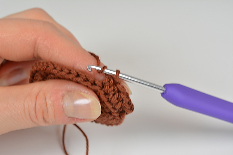 Varv 5: Virka hst i hst med nedtag i bakre mb (samt gärna öglan bakom för bättre stadga). Det bildas då en rand på utsidan av de främre mb.