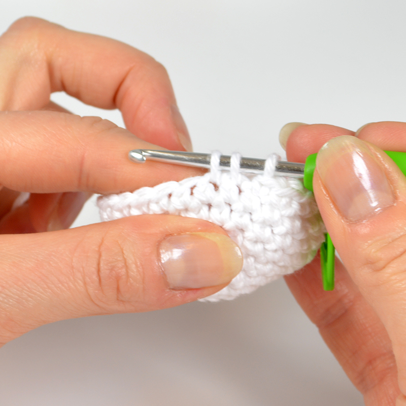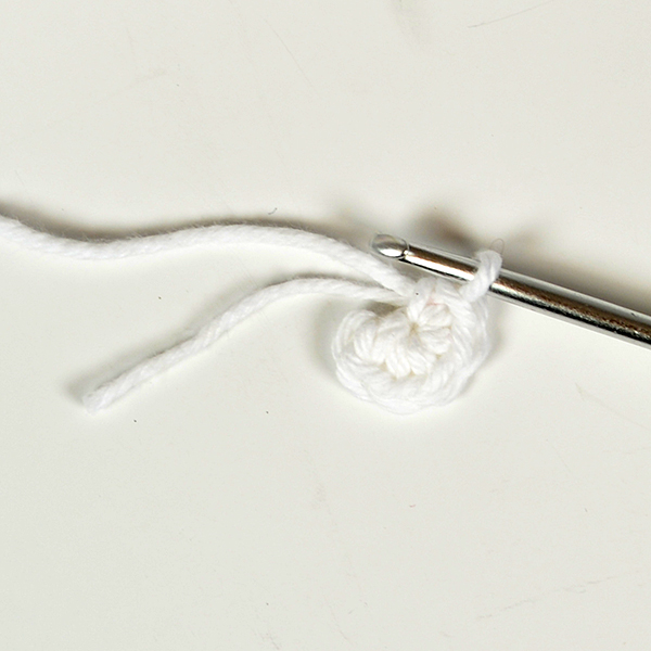 Varv 1: Gör en magisk ring med 2 lm (= 1 hst) och 9 hst = 10 hst.