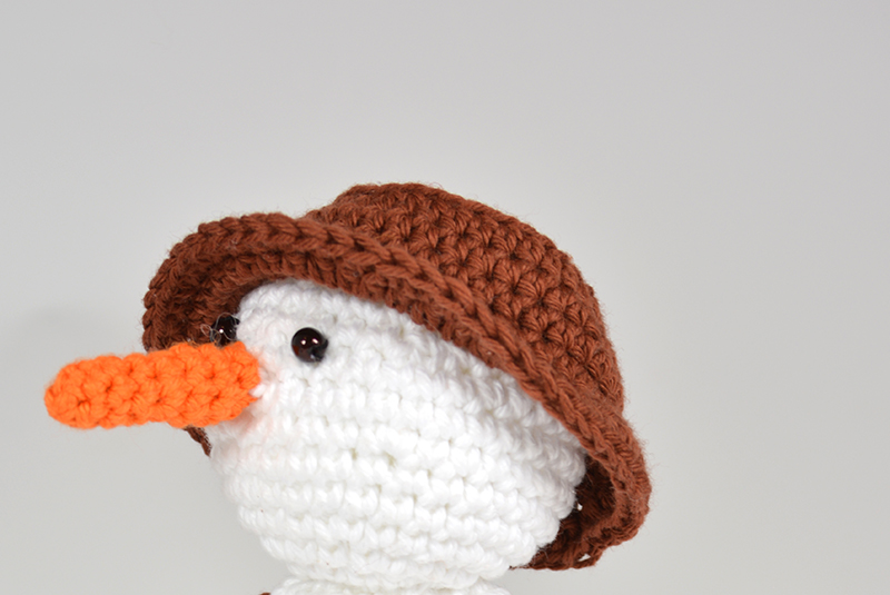 Garnet är vit Soft Cotton till kroppsdelarna och Minibomull till armar, hatt och morotsnäsa. Du behöver även virknål 3.5 och 2.5, samt markör, fyllnadsvadd, nål (gärna en lång) samt sax. Till ögon och knappar har vi använt små pärlor.