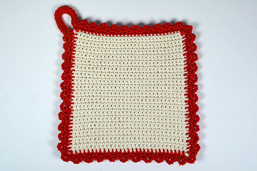 Tips: För att få en tjockare grytlapp virkar du en till likadan ruta. Varför inte i en annan färg? Se bara till att du gör lika många varv på de båda rutorna!