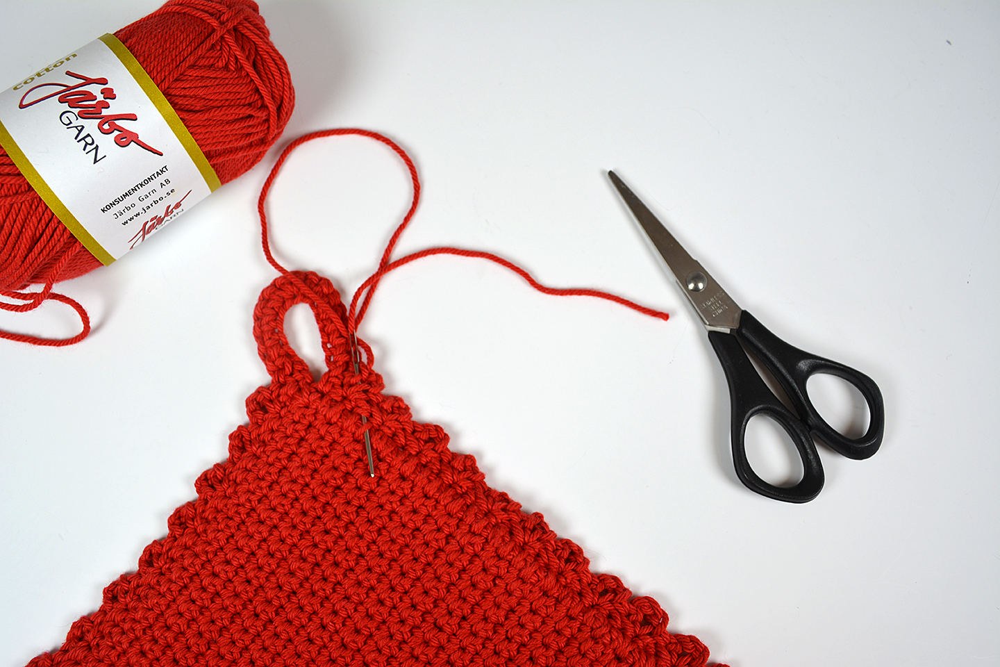 Ta av garnet och fäst alla lösa trådar. MEN ska du fortsätta virka kanten runtom i samma färg så ta INTE av garnet. Sätt en nål eller en tråd i öglan så den inte repar upp sig.