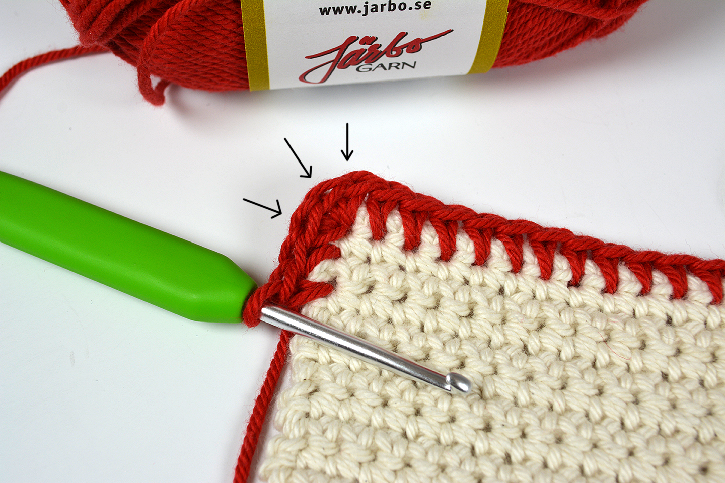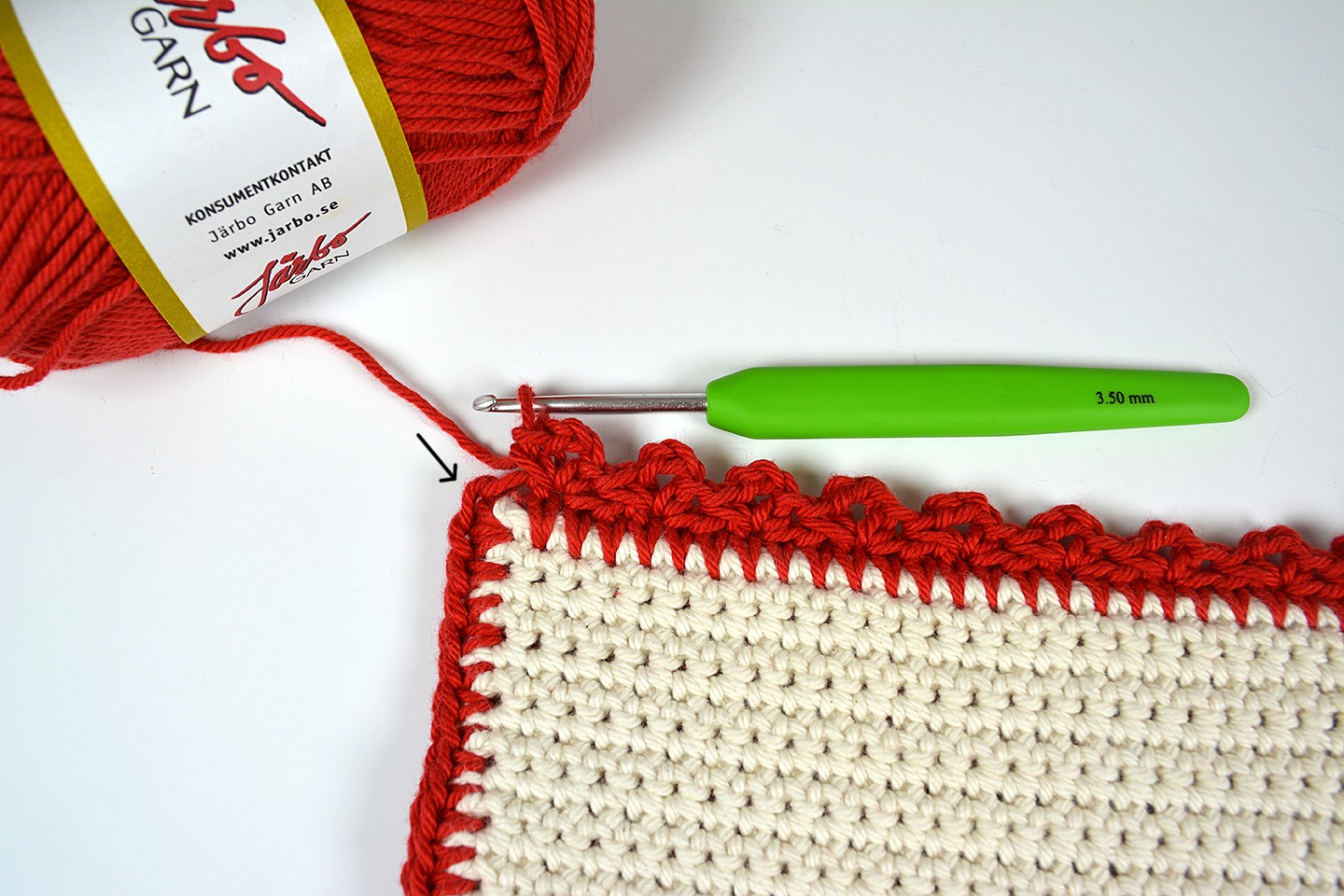 Börja i det hörn där du slutade virka. Sista varvet ska du ha åt höger. Första nedtaget görs i hålet som pilen pekar på, d.v.s. under det sist virkade varvet.