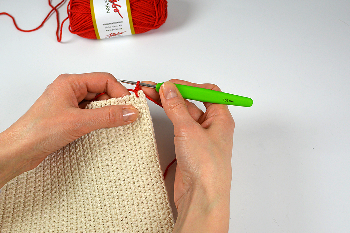 Fortsätt virka fasta maskor längs sidorna. Gör nedtag i varje varv yttersta maska och i varje maska på de andra sidorna. OBS! Dra upp öglorna ganska långt, så inte kanten stramar.